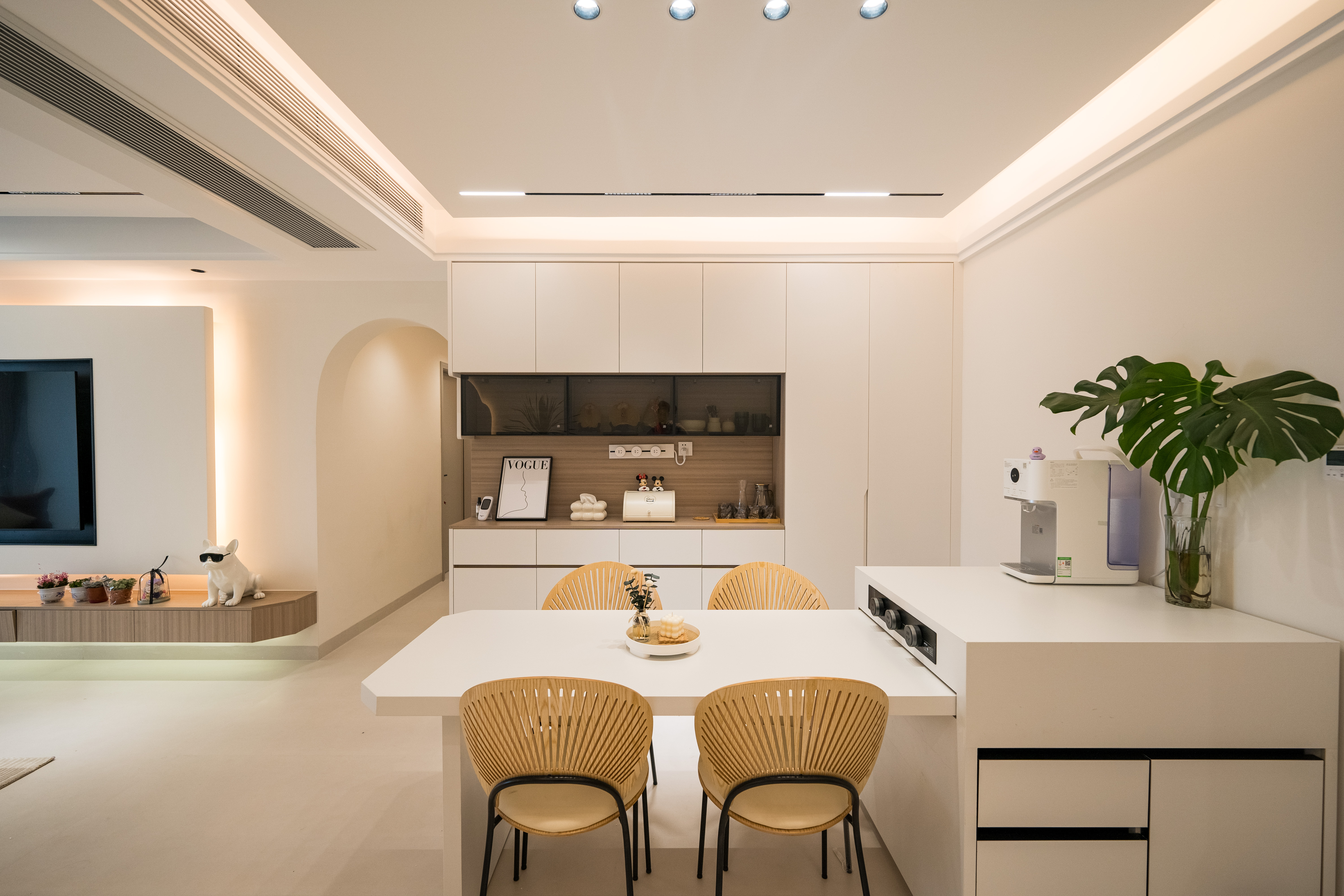 走进这处奶油风格的住宅,首先映入眼帘的是宽敞明亮的玄关。设计师巧妙利用空间,打造了一款简约而温馨的玄关柜。柜体采用奶油色调,搭配柔和的灯光,营造出一种温暖而舒适的氛围。地面铺设了柔软的地毯,为归家的家人带来一份贴心的关怀