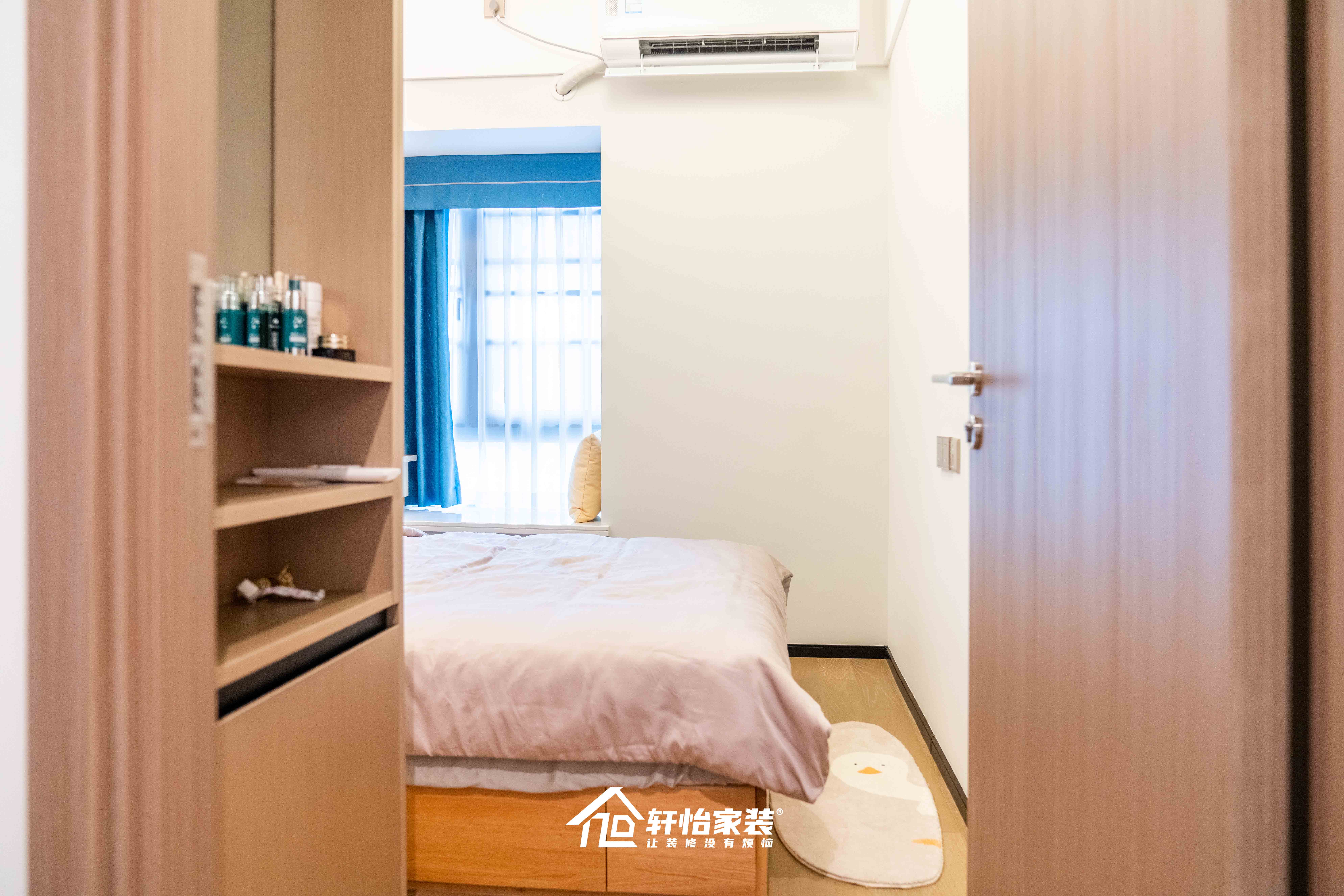 入门处的L型转角衣柜,隔板设计巧妙,放置护肤品等物品,充分利用空间,增强卧室收纳功能。