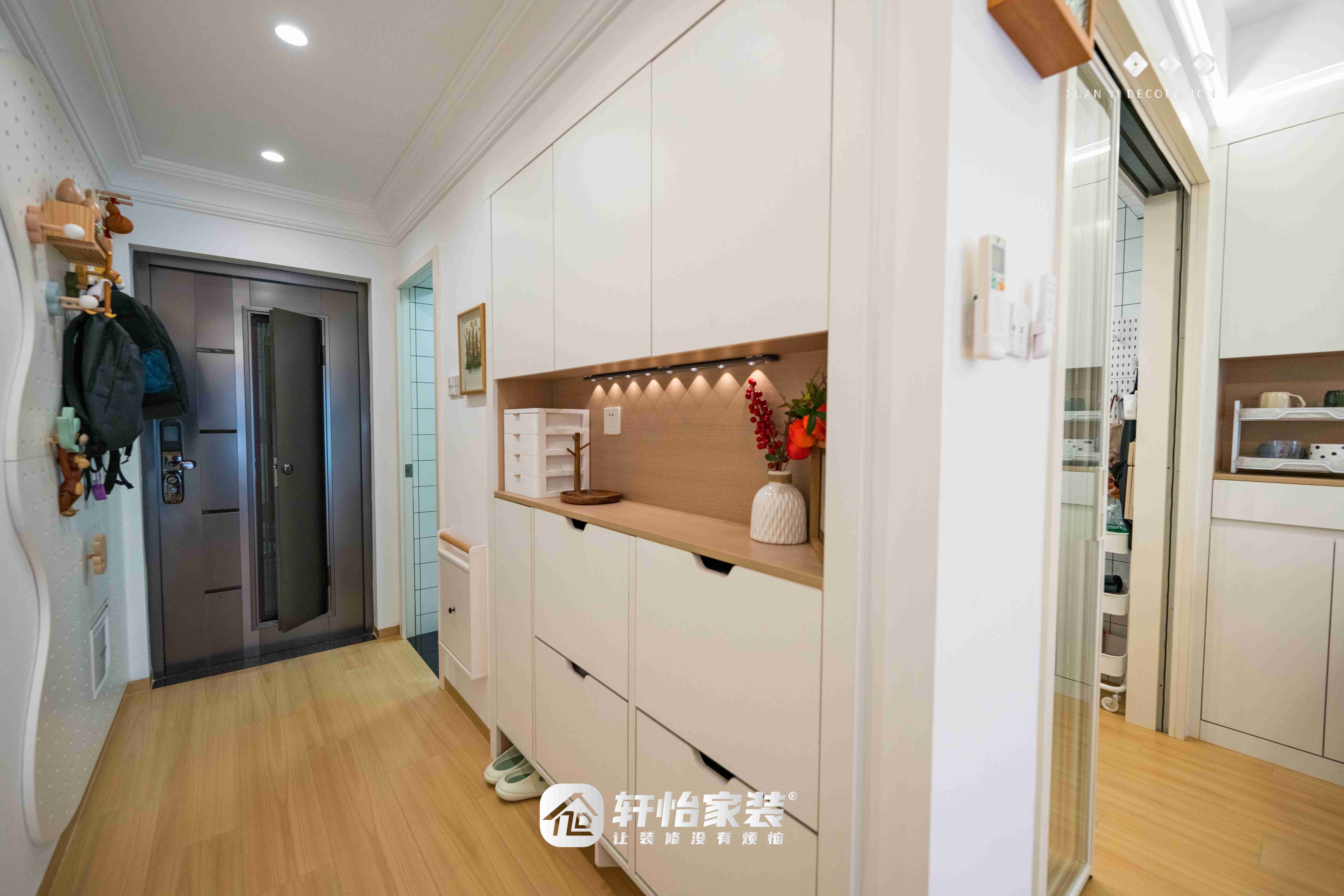 玄关的空间布局充分考虑了实用性和便利性。设计师在玄关处设置了一个实用的鞋柜,方便业主收纳鞋子和杂物。鞋柜采用原木色,与整体风格相协调,同时其简约的设计也符合日式风格的审美要求。