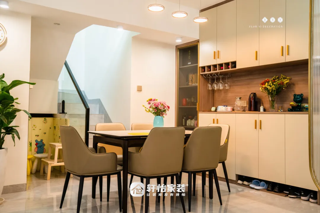 一踏入家门,餐厅的温馨气息便扑面而来。设计师独具匠心地将玄关柜与餐边柜完美融合,形成一体化设计,让归家的您能够“就近使用”,既方便又实用,同时也不妨碍柜子为餐厅提供周到服务。