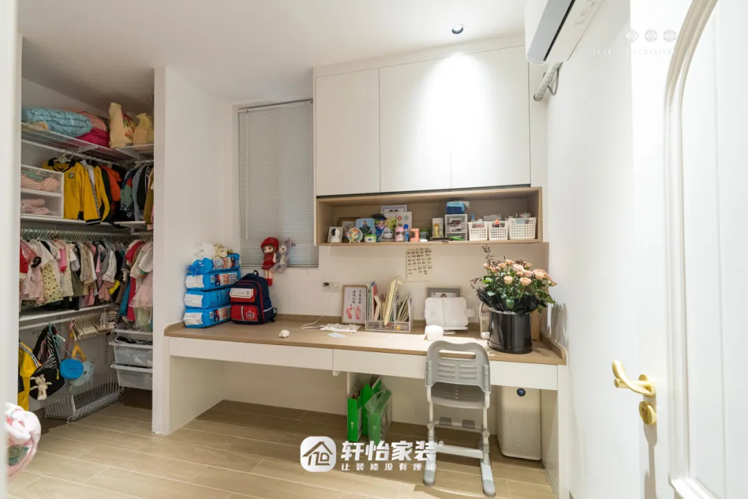 轩怡家装在儿童房的设计中,窗前整面墙被打造为学习区,为孩子们提供了一个宽敞明亮的学习环境。双人位书桌使用自如,开放格与掩门柜的组合保证了充足的收纳空间。桌面上摆放着气质温柔的玫瑰和散落的玩偶,增添了一份童真与趣味。