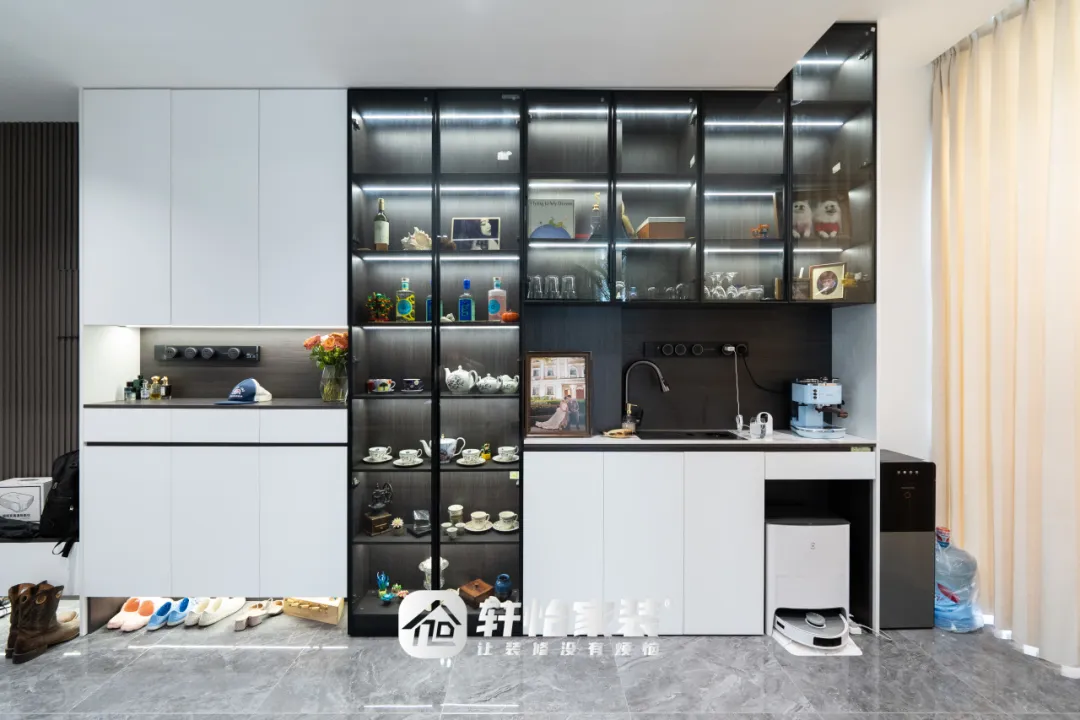 玄关的设计是整个别墅的起点,也是风格的营造之处。整面定制柜串联起各司其职的两处空间,突破结构的限制,让归家的宁静之意浑然天成。玄关柜与水吧合二为一,黑白的极简配色彰显出设计的理性与克制。