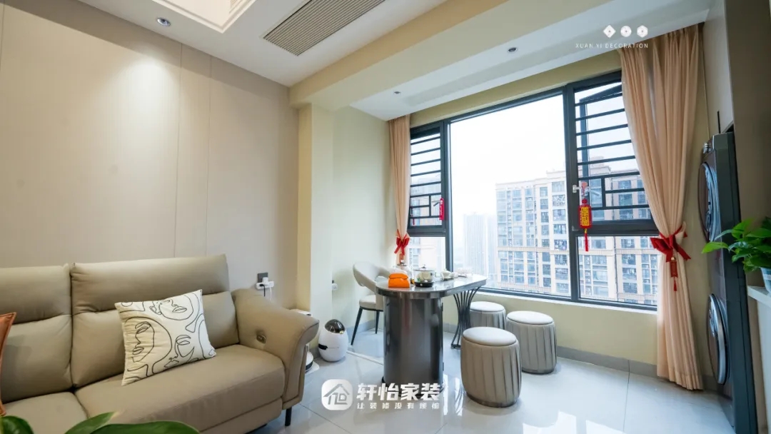 阳台的改造也是本次设计的亮点之一。拆除推拉门后,阳台与客厅融为一体,既扩展了客厅的空间,又增加了功能性。休闲区的设置,让人可以在这里品茶、聊天、享受悠闲的时光。凹陷位定制的洗衣区,更是将空间利用到了全部。