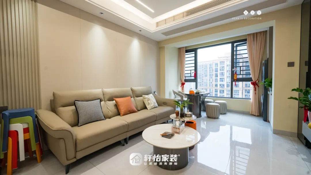 客厅的设计简约而不失温馨。淡灰瓷砖与米色软装的完美结合,营造出一种舒适而宁静的氛围。悬浮式双眼皮吊顶和无主灯的设计,让空间更加通透,光影效果也更加完美。