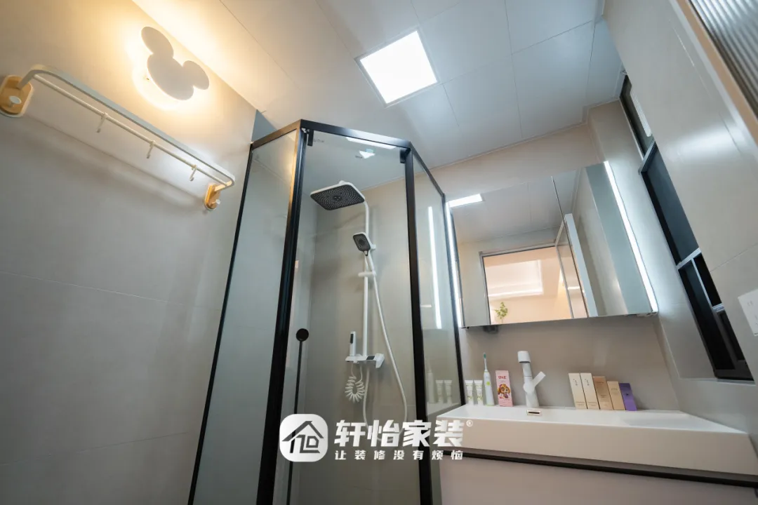 镜柜与浴室柜的双重收纳设计,让台面无杂乱之感,方便居住者随时整理个人物品。墙面的米奇壁灯则是点睛之笔,为传统设计增添了一抹童趣与创意。
