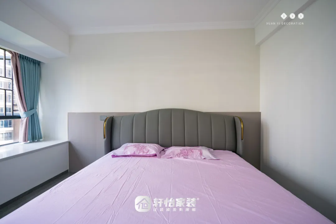 主卧的设计注重舒适与实用。利用走廊定制满墙衣柜,不仅增加了收纳空间,还使得空间更加整洁有序。顶面补加的简约主灯,提供了明亮的光线,方便日常起居。
