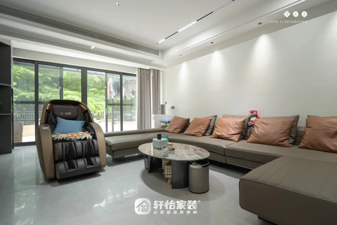 在软装布置上,设计师巧妙地运用了减法原则。简约而圆润的沙发,以木脚为呼应,与整个空间的主题相得益彰。波纹地毯的设计,充满了线条感,不仅凸显了空间的质感与触感,更为整个空间增添了一份优雅与宁静。阳台柜的设计,巧妙地收纳了洗衣机及家务用品,释放了空间,保持了公区的整洁。同时,也缩短了晾晒的动线,为居住者带来了极大的便利。