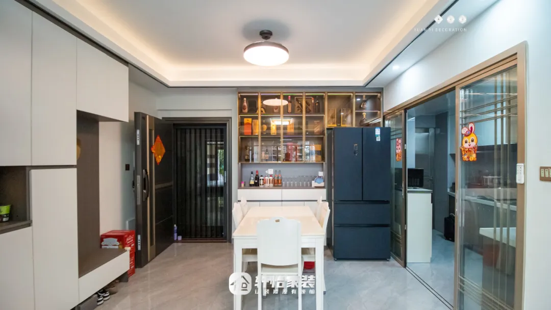 餐厅的布局简约而不失优雅,色彩和材质的选择上下足了功夫。白色的家具、黑色的冰箱、透明的玻璃与灰色的地砖相得益彰,共同营造出一种温暖而舒适的氛围。餐边柜上半部改为透明酒柜,为男业主的藏酒提供了完美的展示空间。柜体线灯的光与顶灯洒下的光交融在一起,为整个空间增添了一抹精致感。
