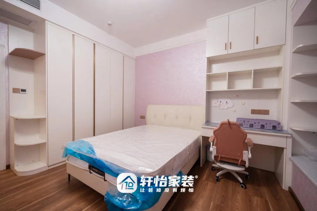 次卧的设计则更加偏向于甜美与实用的双重奏。粉色珠光壁纸的满铺让整个空间充满了纯然甜美的气息仿佛置身于一个梦幻的童话世界。床侧衣柜的一门到顶设计不仅视觉上拉升了层高更让空间显得更加整洁与有序。拉手处的玫瑰金底更是为整个空间增添了几分奢华与精致。飘窗与睡床间开辟出的学习区则为小房主提供了一个专心的学习空间上方的吊柜与开放格合并应用则为书籍与摆件提供了完美的收纳之地。