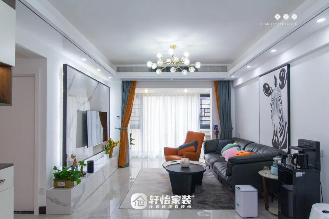 客厅作为家庭的重心区域,其改造效果自然不容小觑。设计师将阳台与客厅打通,并选用了大面积的落地窗设计,让室外的绿意与阳光毫无保留地涌入室内。深色系的皮沙发沉稳大气,橙色单人椅与跳色抱枕则为整个空间增添了一抹亮色与活力。天花板上的一体式设计与黑色不锈钢带点缀相得益彰,主吊灯的别致造型更是成为了整个空间的点睛之笔。