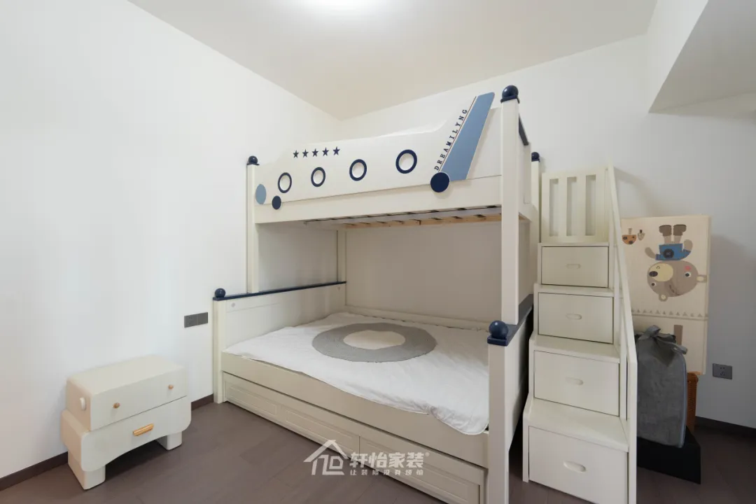 儿童房的设计则更加注重实用与趣味性的结合。错位上下铺的设计,不仅增加了孩子的活动空间,还避免了传统上下铺的压抑感。依窗设计的写字台,保证了良好的学习光线和视野。定制衣柜的线条感与简约氛围相得益彰,为孩子打造了一个既实用又美观的学习与休息空间。