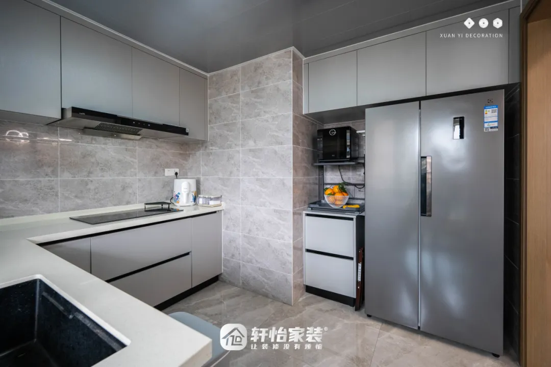 整墙餐边定制柜展现多种收纳方式,透明柜+开放置物区+封闭区,一墙定制柜三种收纳方式,美观程度说是一处工艺展示区也不为过。厨房操作台为L型布局,非常实用、流畅、轻奢。另一侧墙体设计为定制区,将冰箱完美放置其中,顶部橱柜收纳力十足。