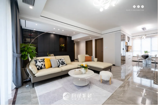 大理石的天然纹理深邃简洁,质感极强,装饰效果贵气十足。定制柜为开放式+封闭式一体化设计,开放区放置物品极其方便,装饰也是效果较好。沙发选用L型皮质沙发,清新的配色在灰色大理石地板与深色定制柜中起到综合作用,整体颇具清新质感。