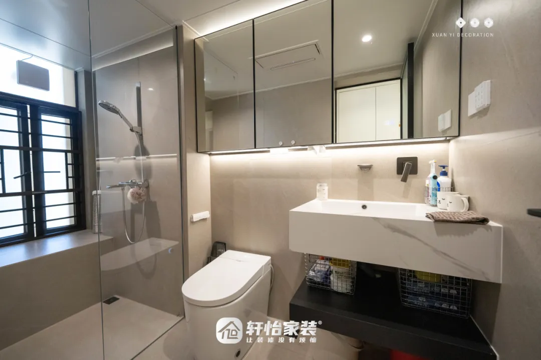 主卫采用高等灰色瓷砖十分简约大气,用玻璃隔断洗漱区和沐浴区,小空间也能实现干湿分离的实用效果。