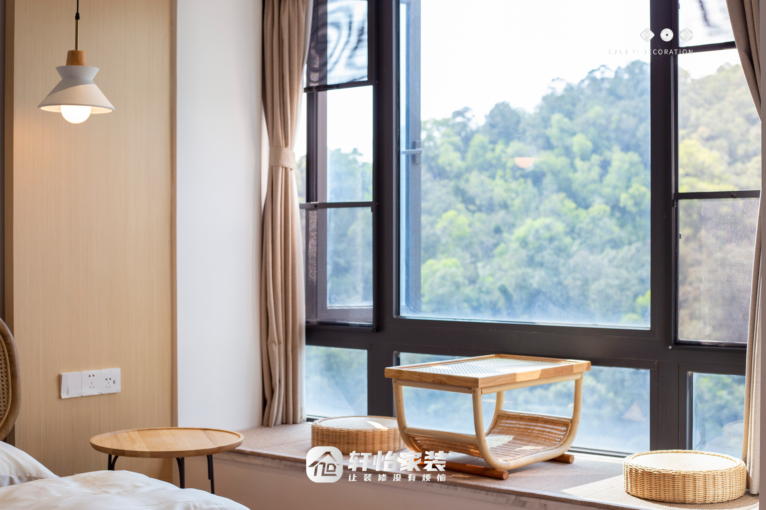 家具极具日系特色,原木+粗布的结合,从容优雅,夏天铺上垫子,感受原木的清凉。