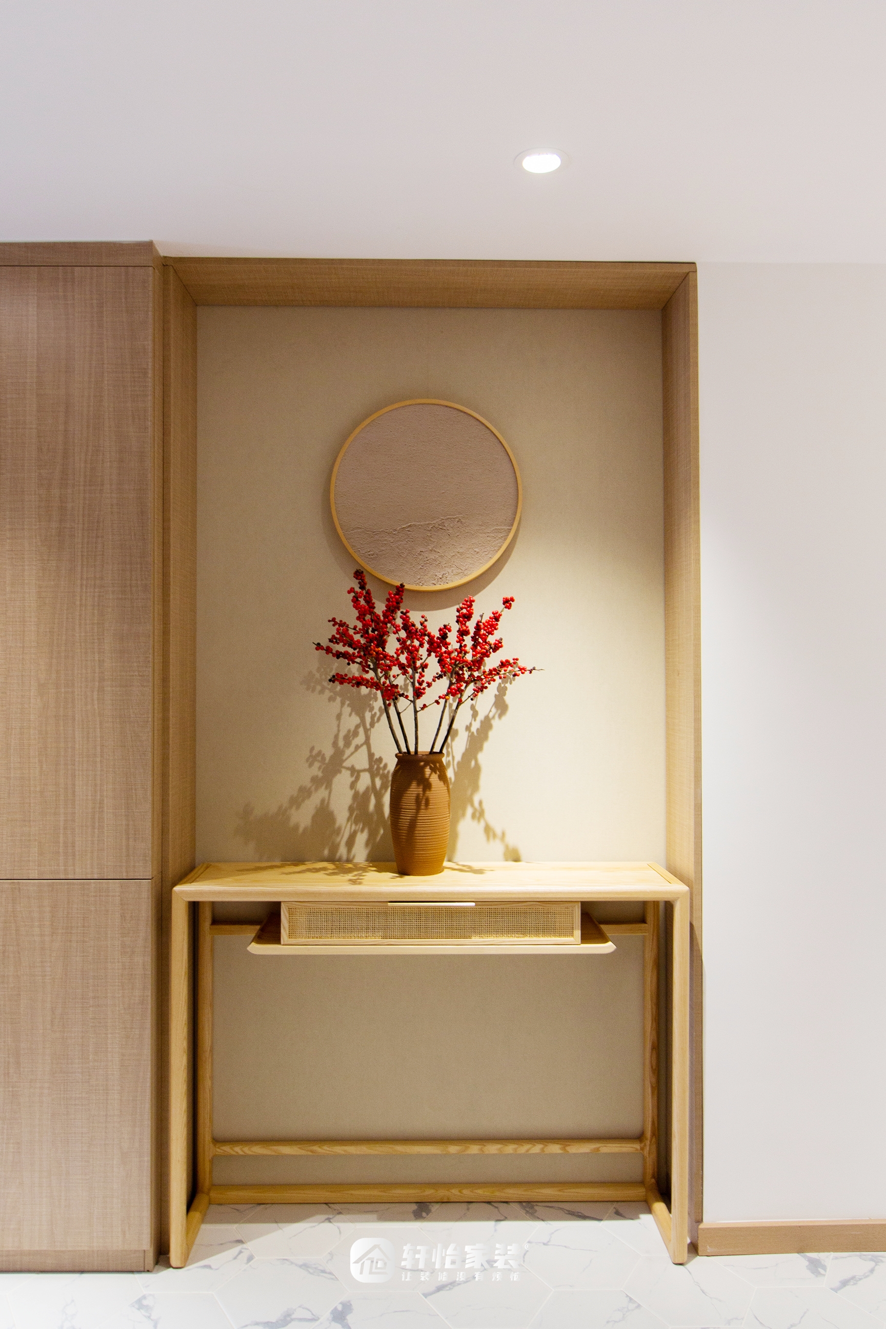 入门玄关柜旁留空的位置,根据中国传统布置了端景,外方内圆,两三枝冬青点缀,温和有亲切感。