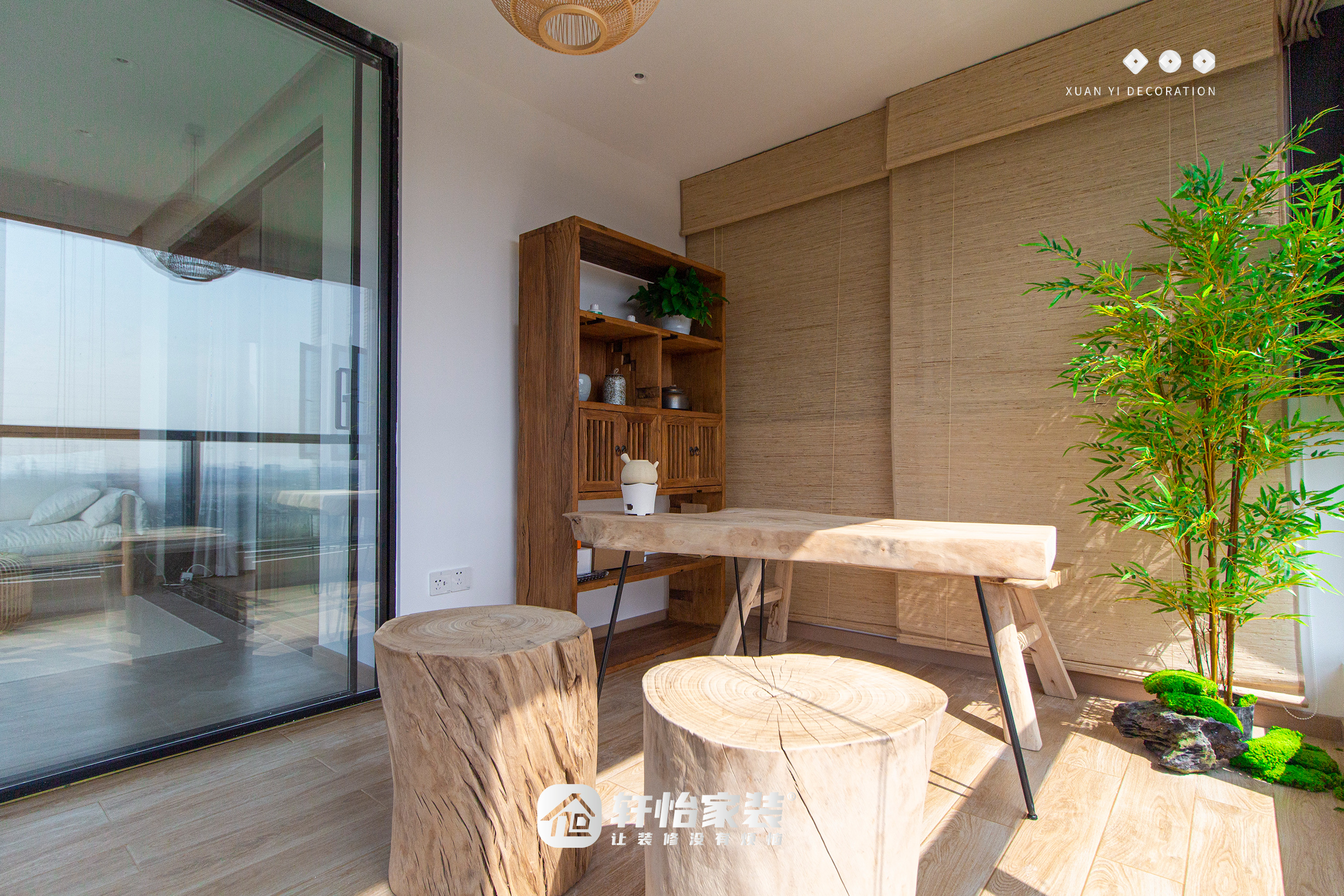 临近客厅的阳台在设计师的主导下,变为休闲阳台。大片原木装饰在阳光的照耀下,充满自然感。