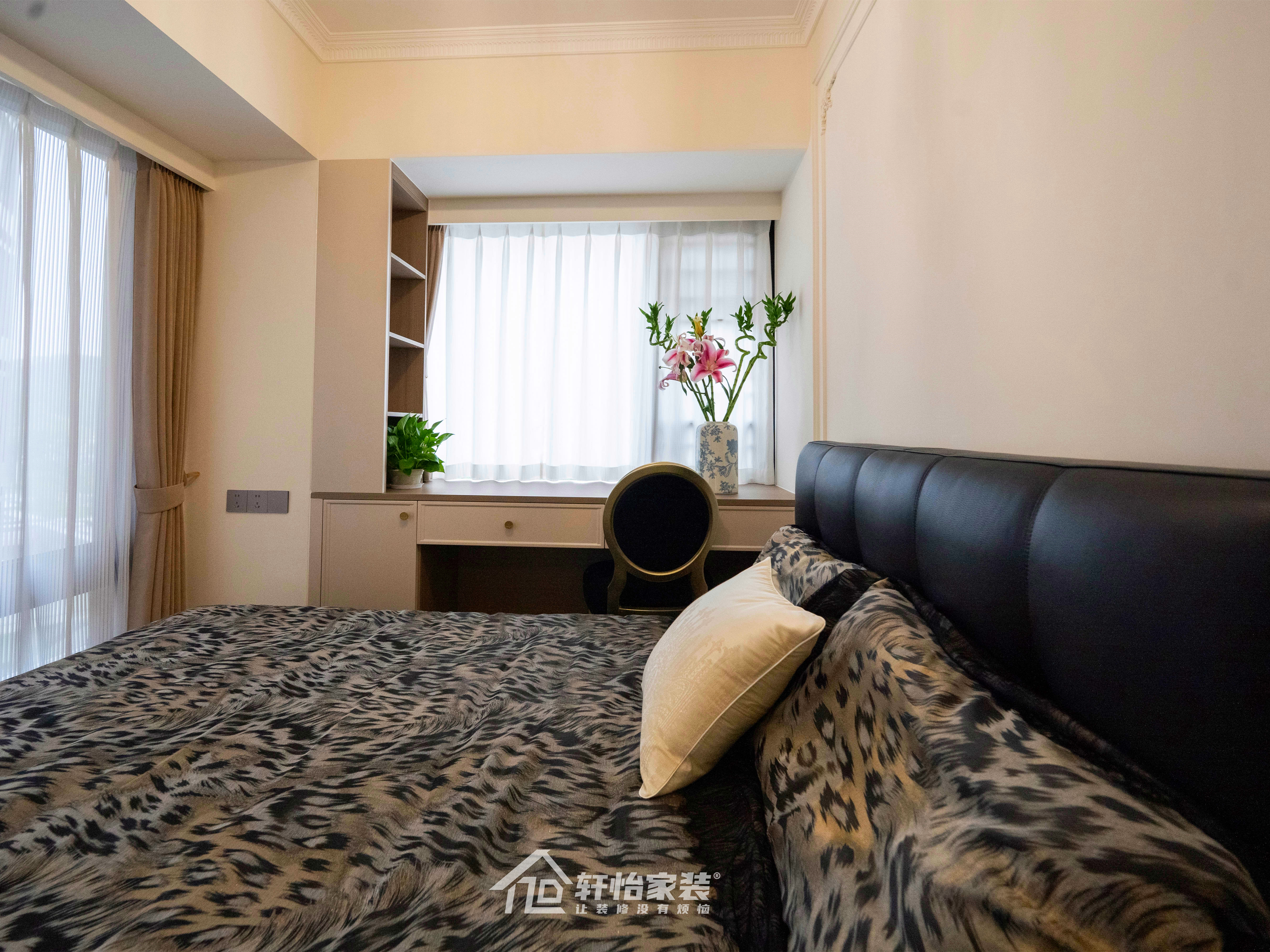 卧室整体设计颇为素雅,借飘窗巧妙设计书桌置物架一体,为卧室增加更多功能性。