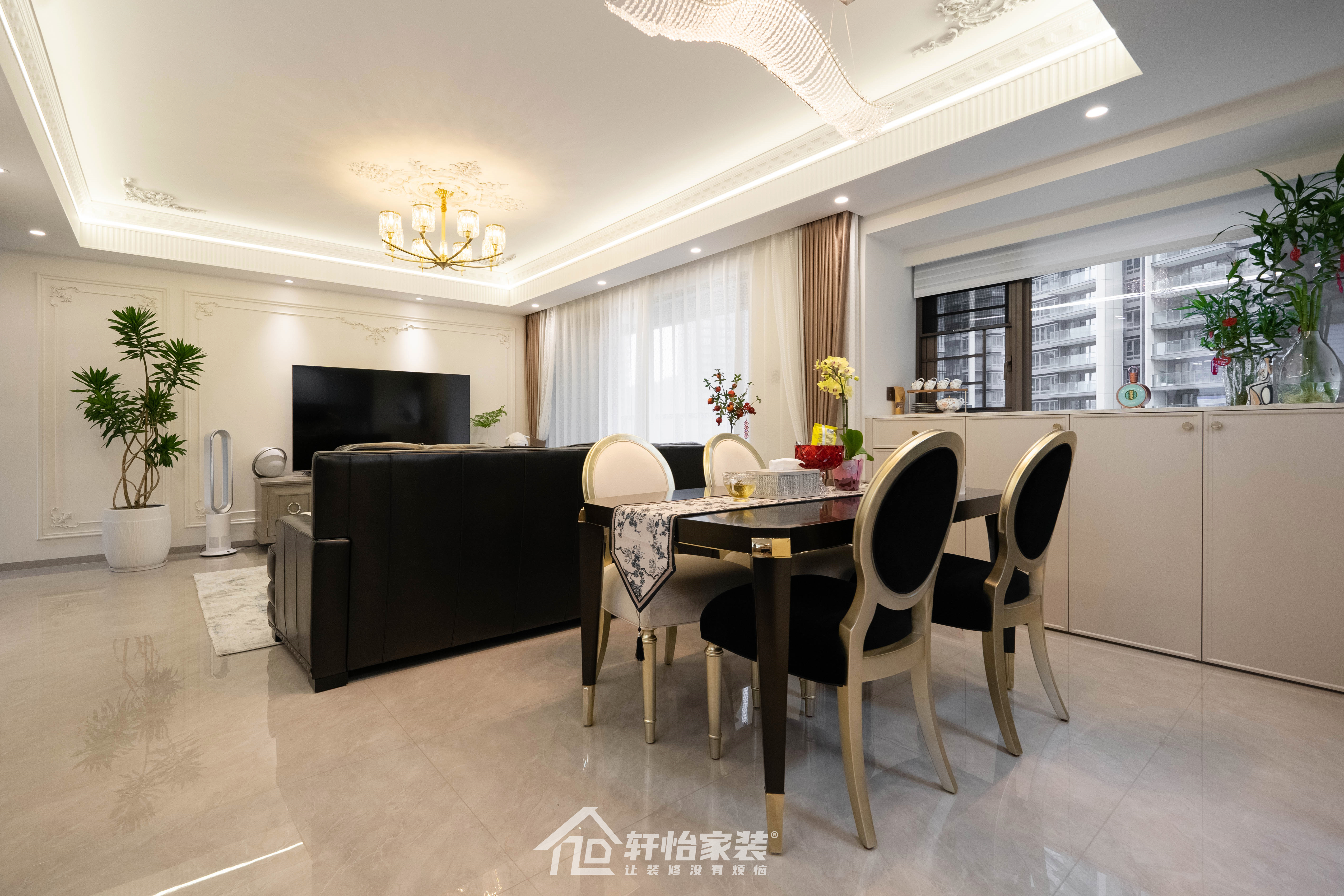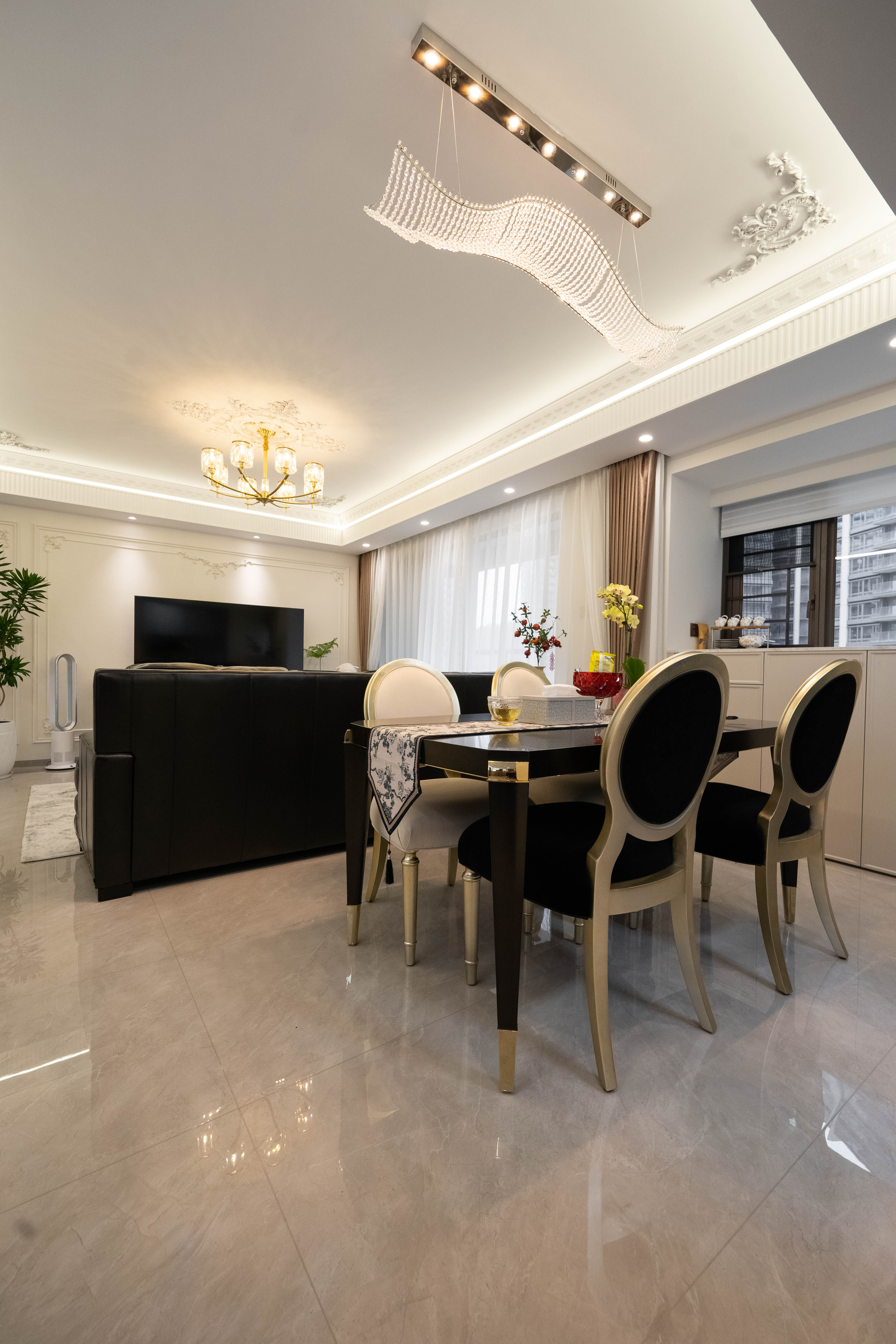 客餐厅的一体化设计,让整个公区更加流畅,黑色餐椅与沙发形成巧妙呼应,色彩在这套法式美家中达成高度的统一。