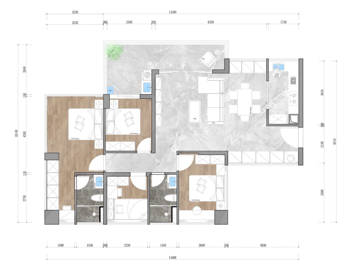 厨房采用透明玻璃门,保证空间通透的同时,也隔去了做饭的油烟气味。