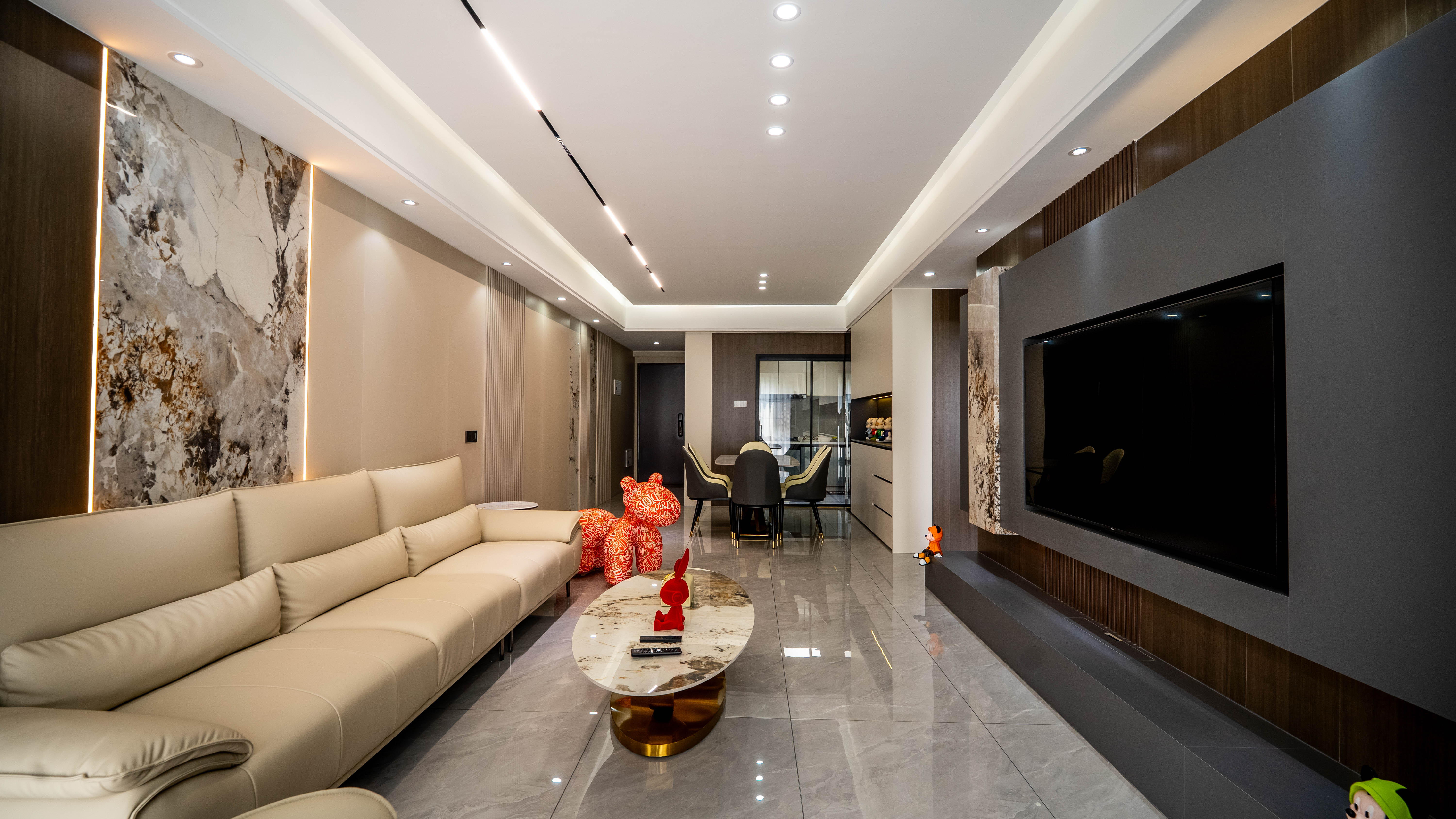 现代简约风格的精髓在于“少即是多”。设计师以棕、灰、黑为基调,通过岩板、木饰面、皮质沙发等不同材质的肌理对比,在理性中营造出细腻的层次与温度。