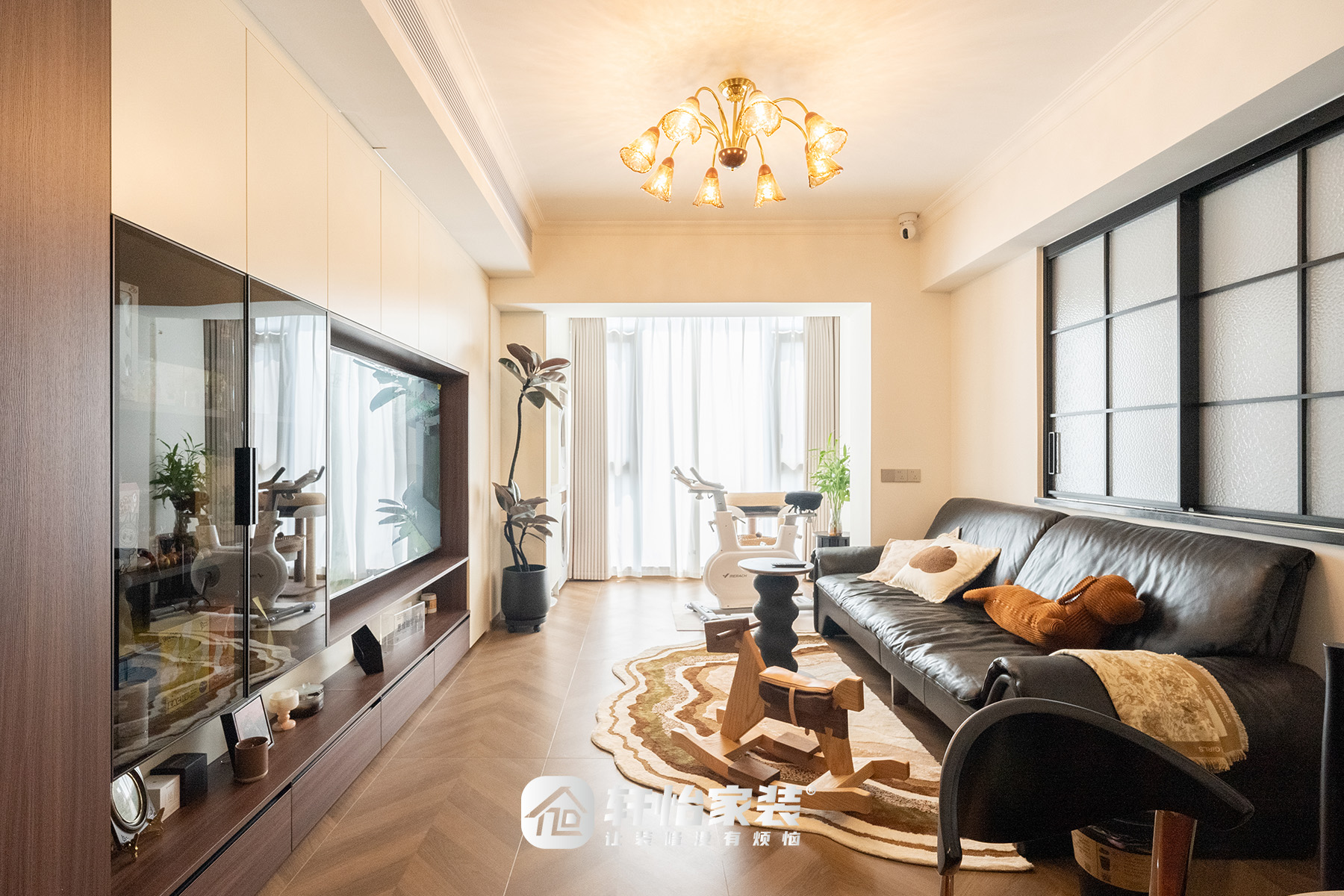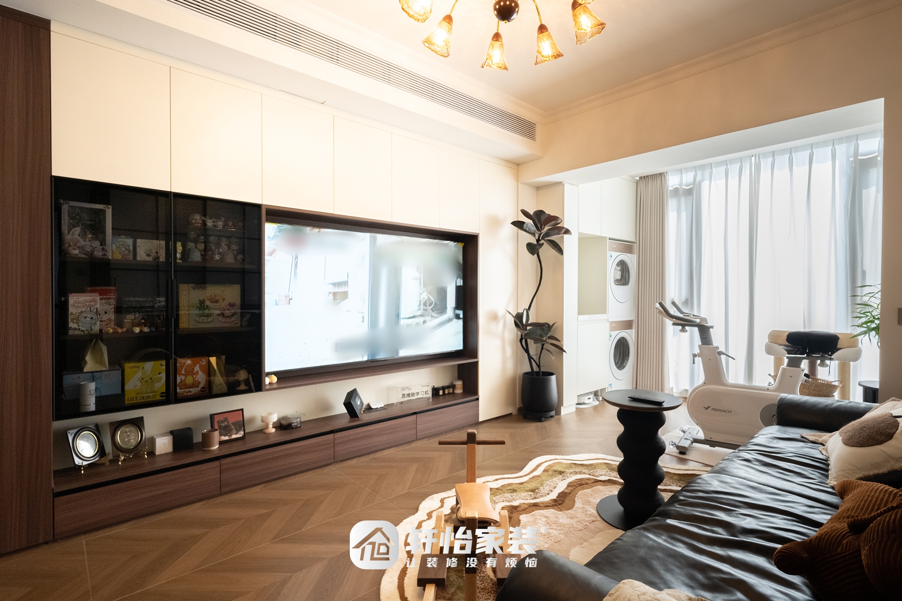 电视背景墙成为视觉焦点,采用深胡桃木与奶白色进行体块对撞,深浅对比间打破了传统矩形构图,兼具收纳功能与艺术美感。