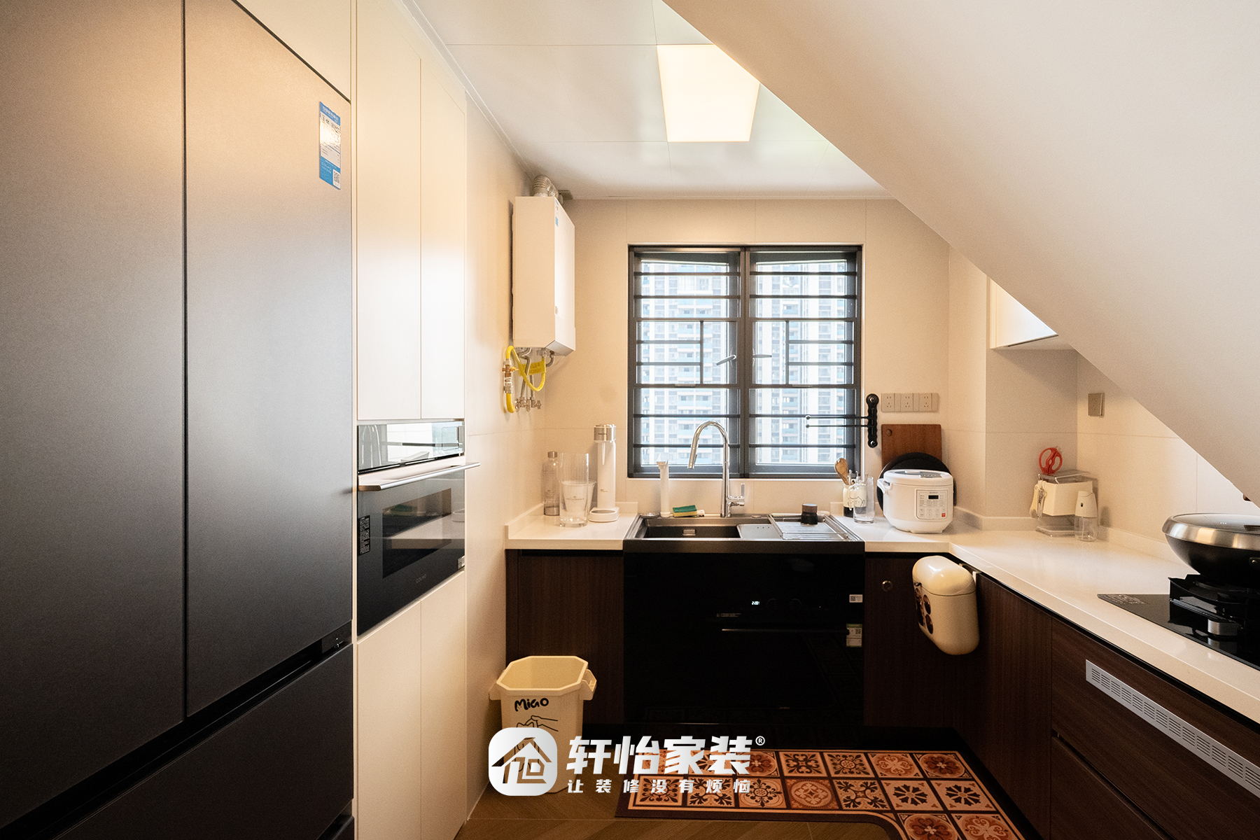 厨房以开放式形态融入公区,U型布局确保了“洗-切-炒”动线流畅效率高。橱柜构成简洁的几何色块,在小空间内铺垫出丰富层次。