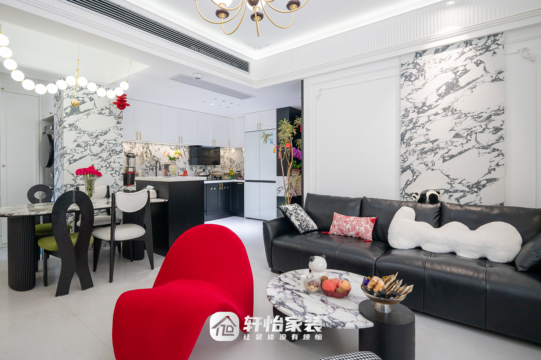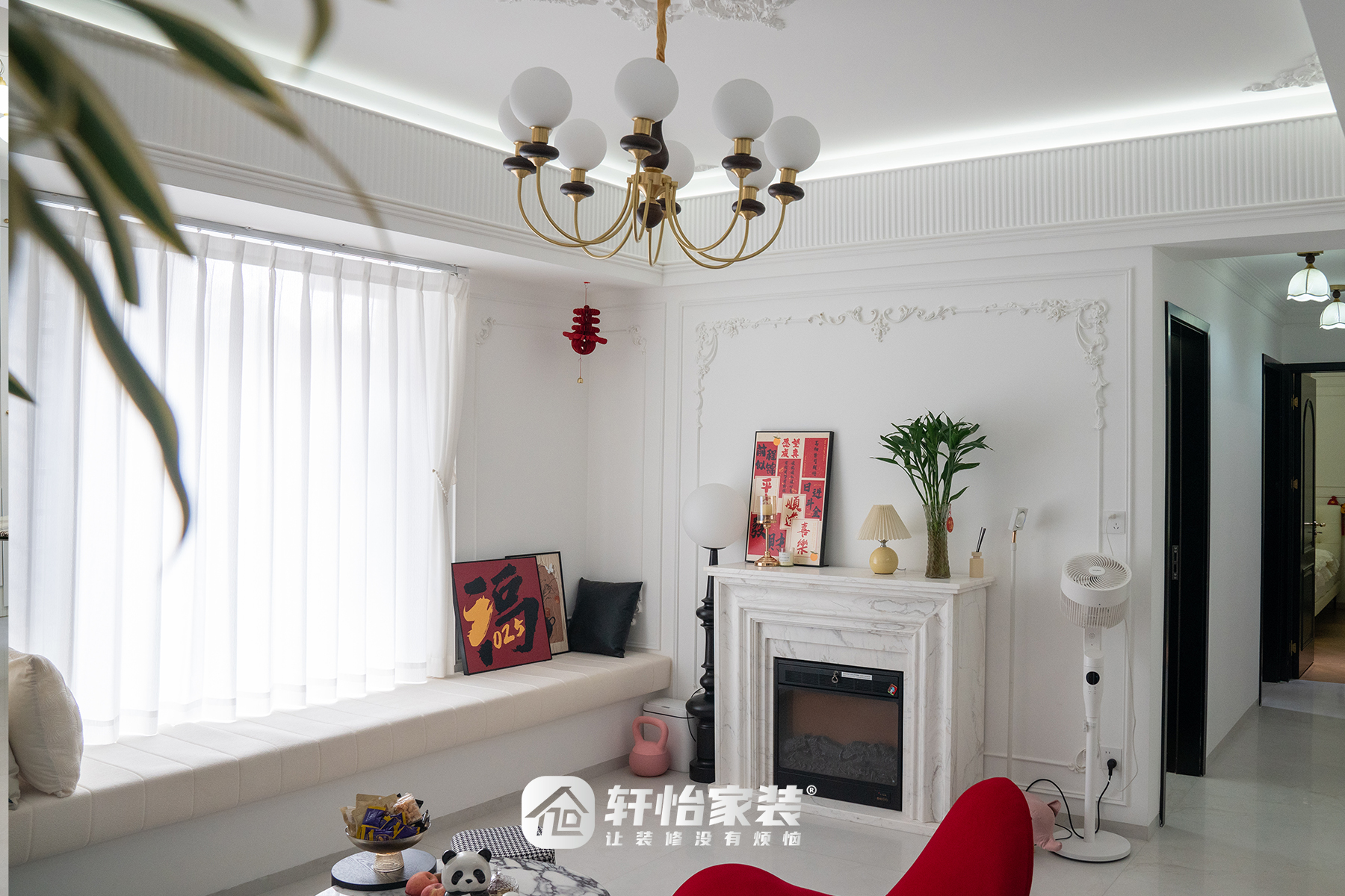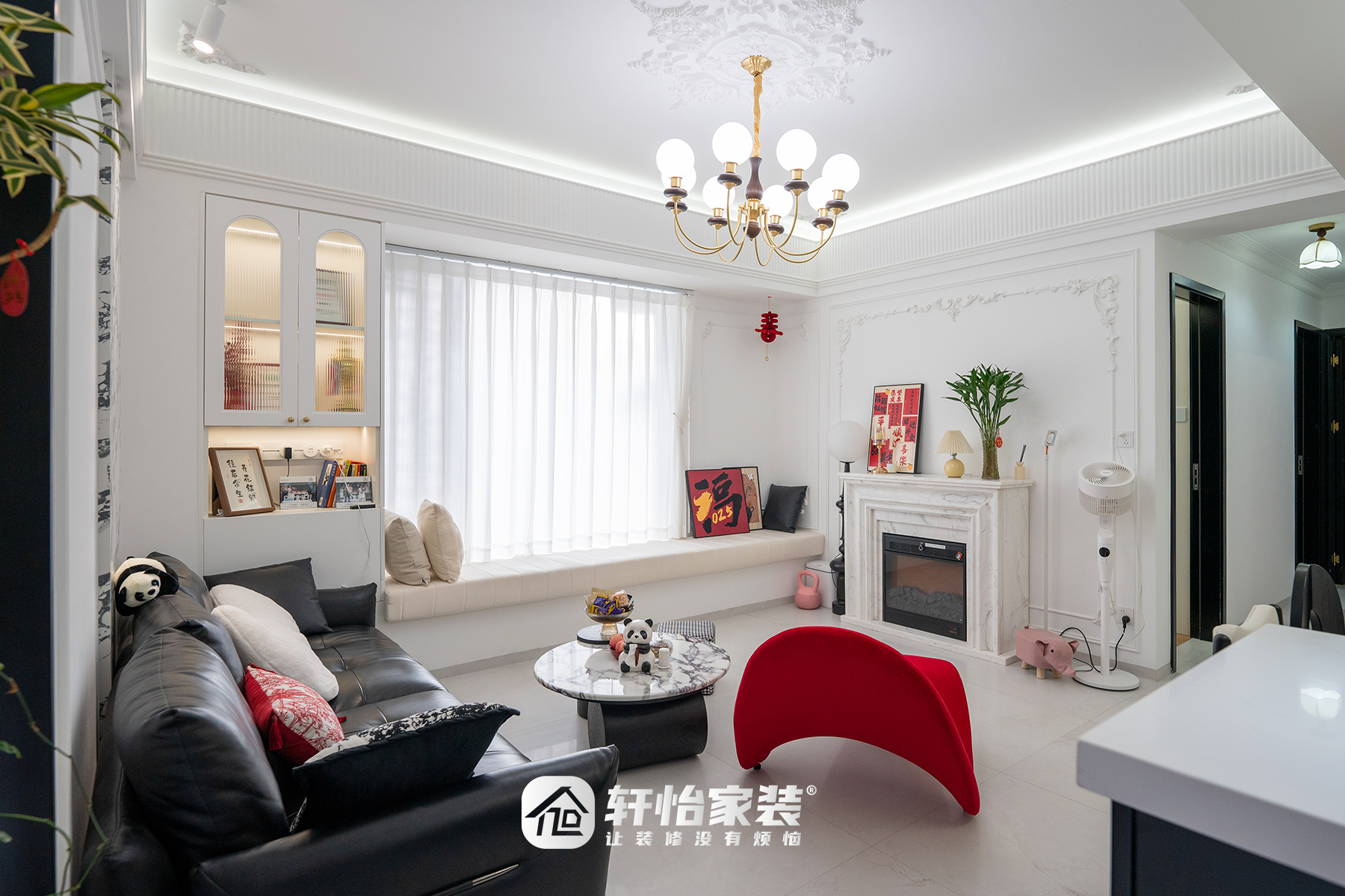 墙面采用奶白底色,搭配精细的雕花石膏线,勾勒出法式优雅轮廓。黑色沙发沉稳大气,局部点缀的红色成为视觉焦点,为素雅环境注入热情活力。