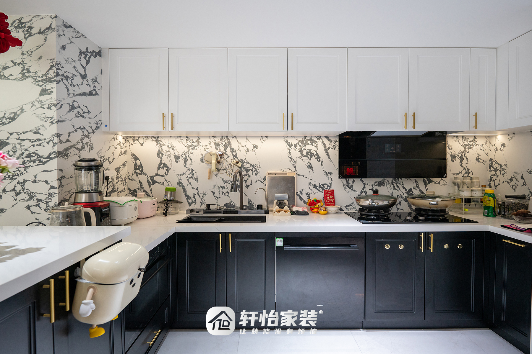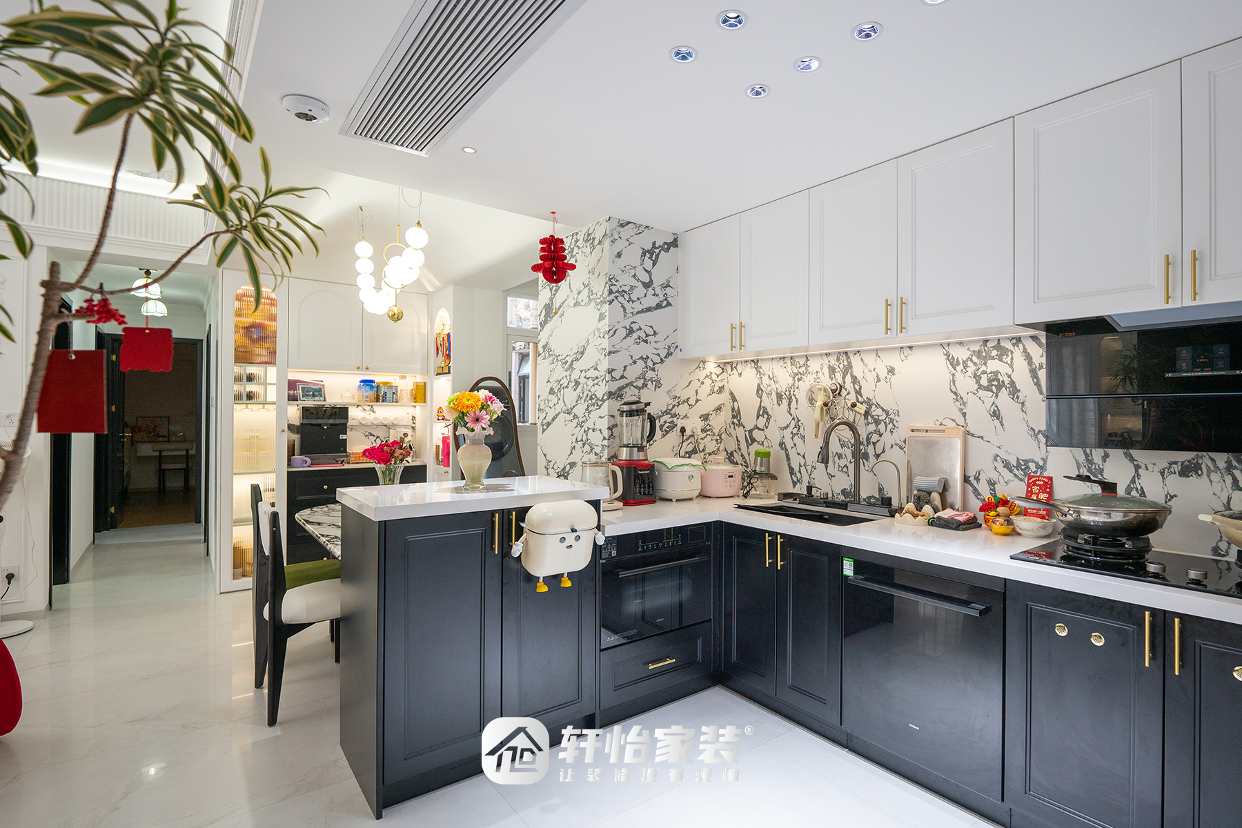 黑色地柜与白色吊柜形成视觉对比,大理石纹路演绎出高贵雅致的华美,将法式奢美感融入生活日常。