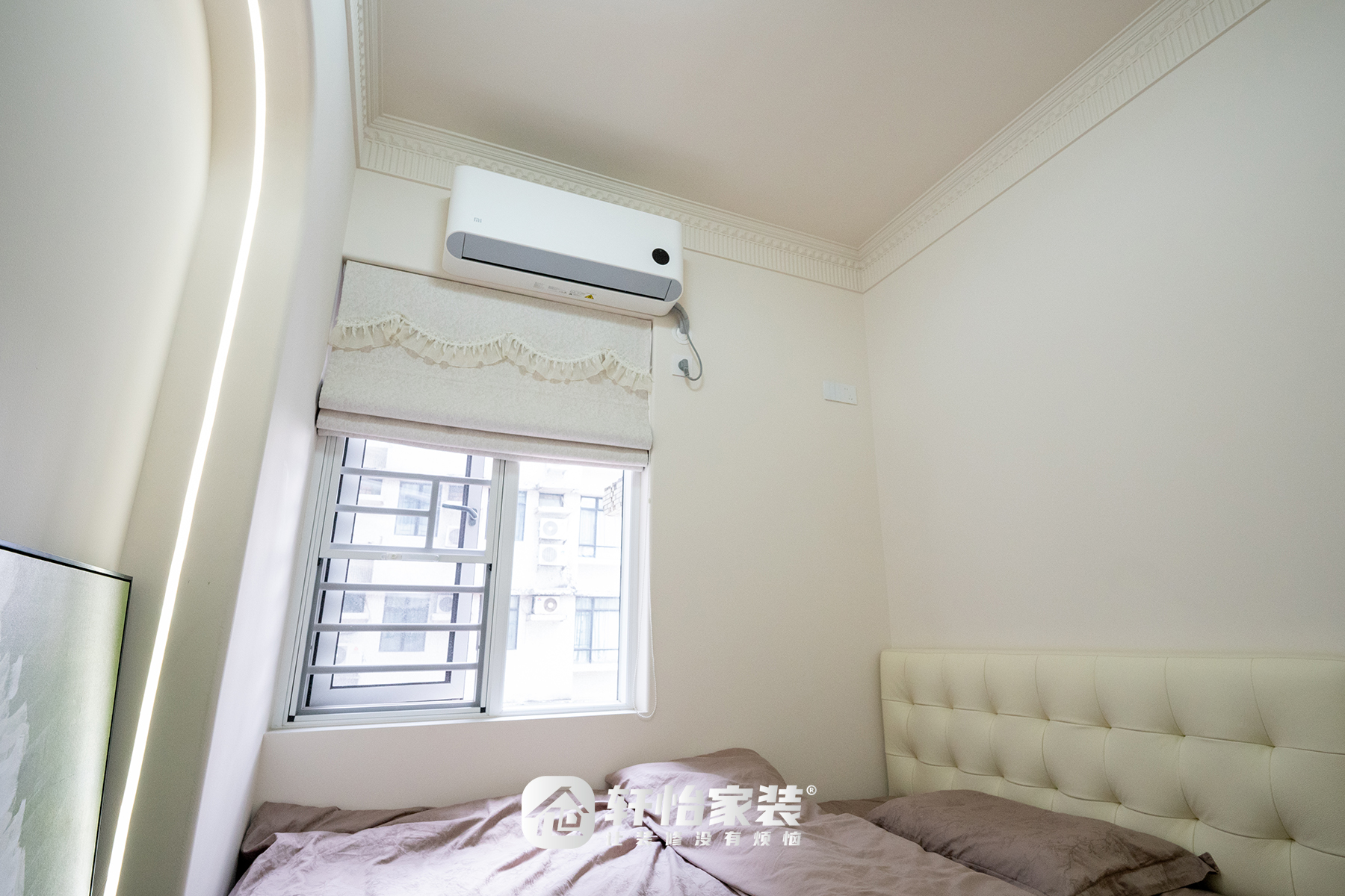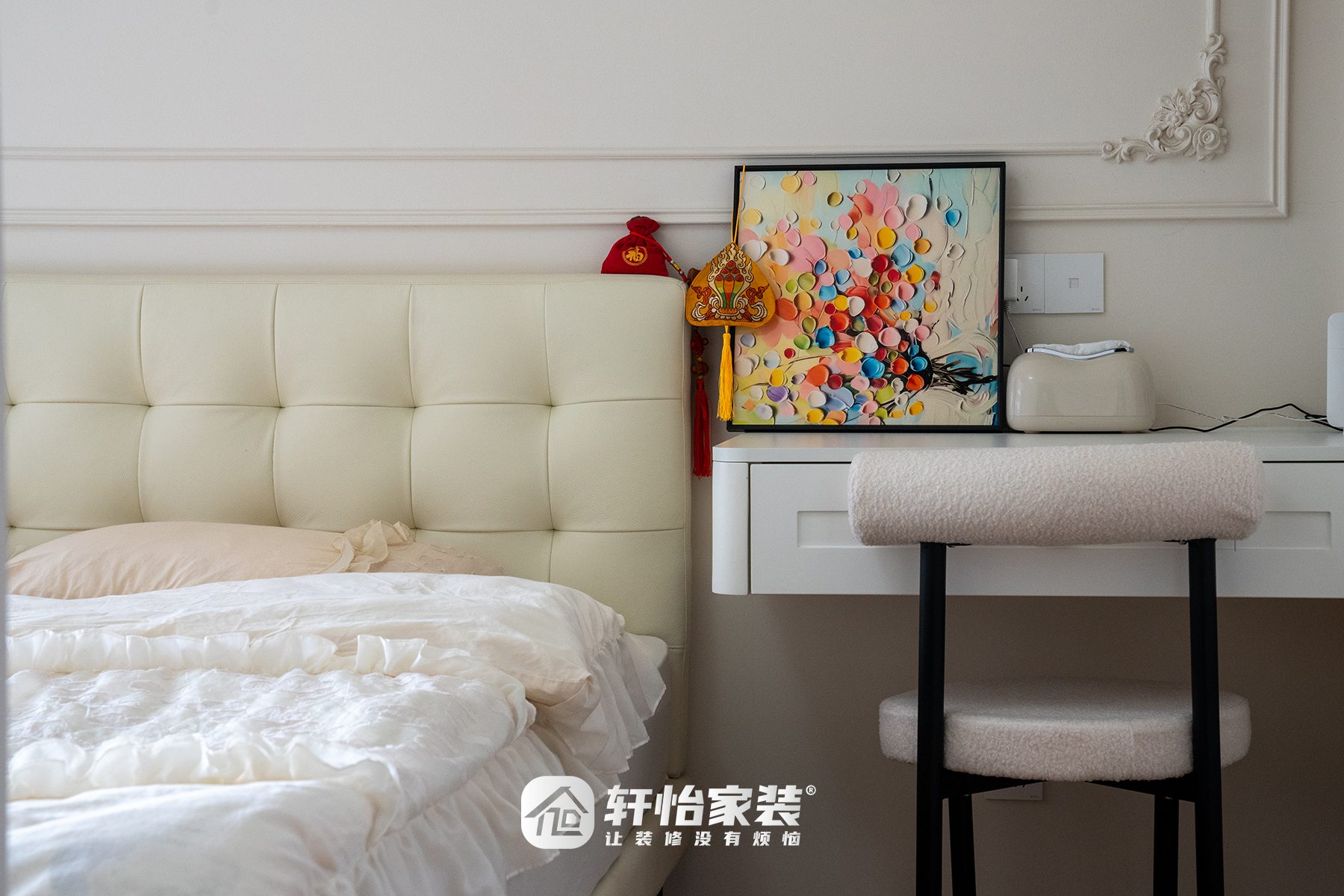 次卧延续法式基调,床尾创意弧线灯带打破空间生硬感,形成天幕般温润柔光,弥漫出生活的柔情蜜意。