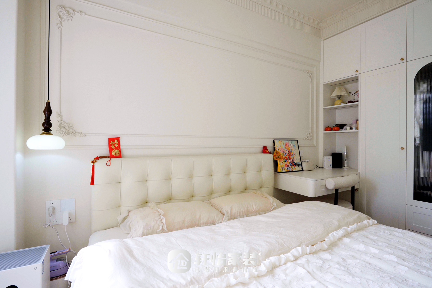 背景墙以石膏线框出优雅比例,小灯从天花板垂落,洒下温暖光晕。衣柜采用顶天立地设计,奶白色调搭配金属拉手,还空间以整洁。