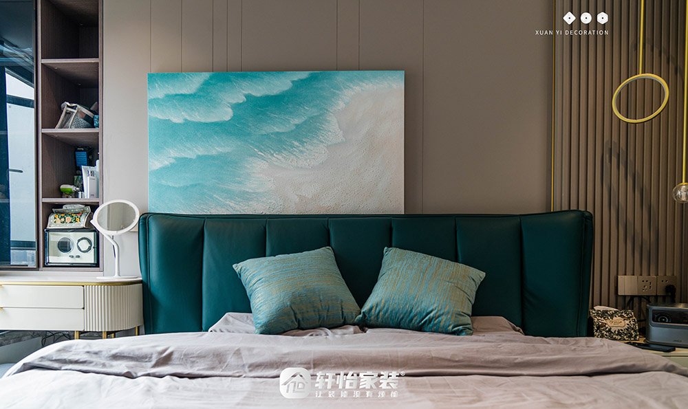 壁画、落地灯、吊灯与绿植相互映衬,共同营造出南法的自然与浪漫。意式沙发与跳色抱枕的搭配,为空间增添一抹亮色,茶几的点缀更是锦上添花。整个空间布局有序堆叠,错落有致,呈现出一种南法effortless的轻松与惬意,让人沉醉其中,流连忘返。