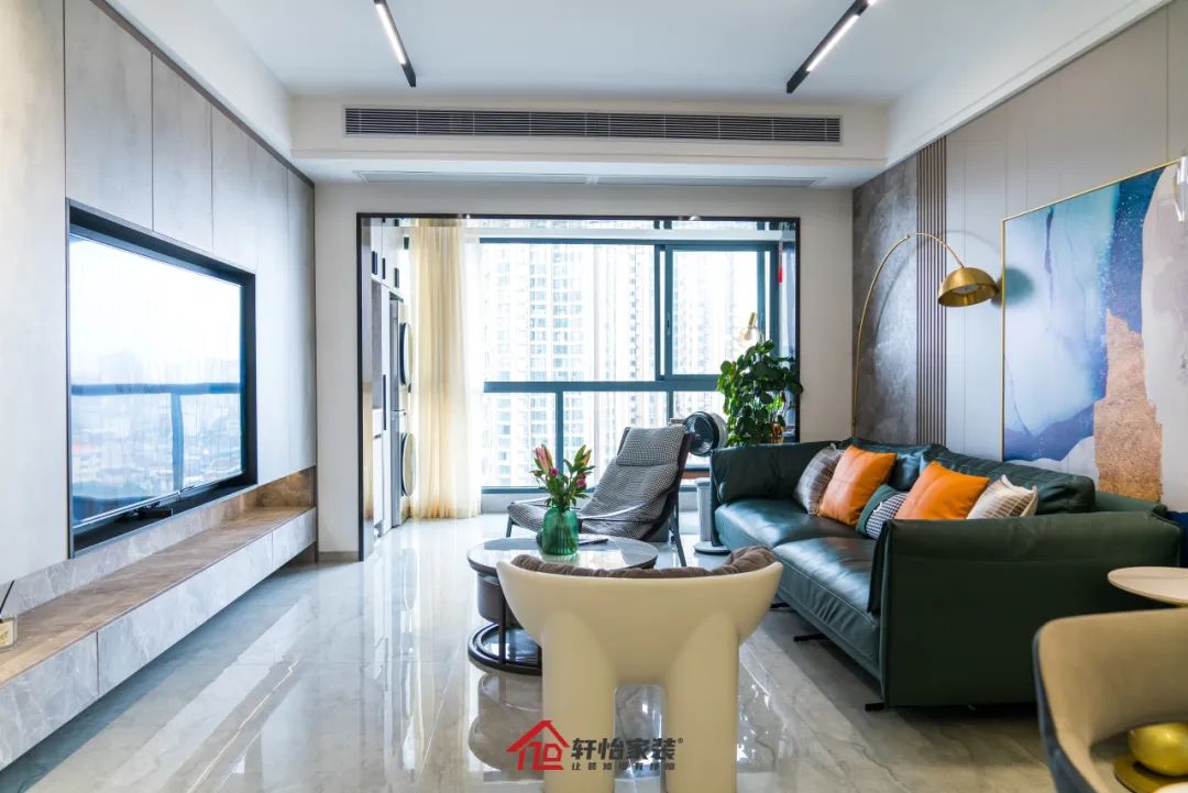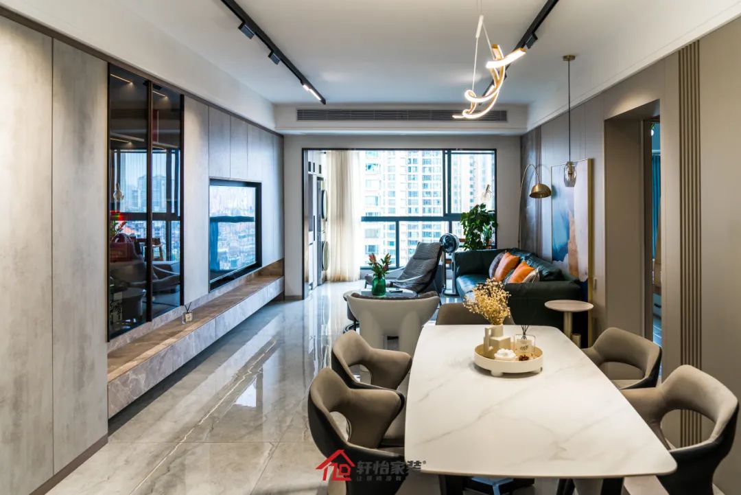 整面定制柜从玄关流畅延伸至客厅,设计感与实用性兼具。轨道灯巧妙植入,为空间增添一抹现代感;长虹玻璃的点缀,让光影在变换中跃动,营造出梦幻般的视觉体验。
