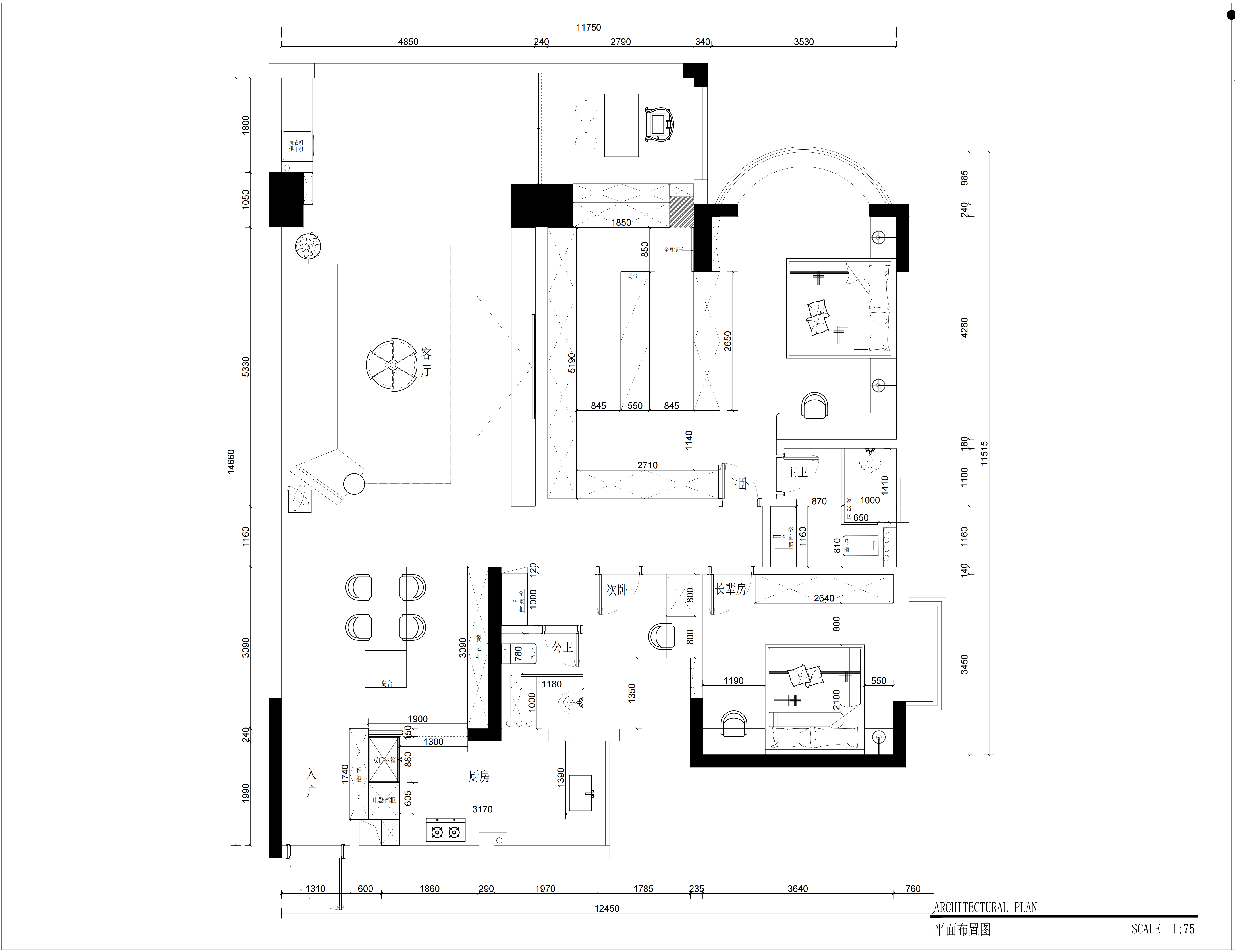 电视背景墙、餐边柜、家政柜均采用嵌入式设计,与墙面浑然一体。主卧的悬浮柜和衣帽间的系统规划,都将储物空间“隐匿化”。