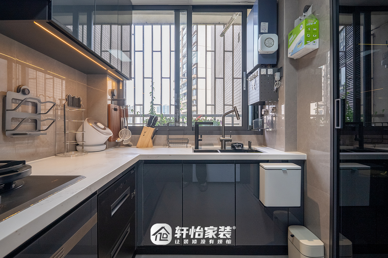 U型布局是厨房的黄金表达。轩怡家装均衡动线、秩序、比例,让烹饪回归舒适自在。吊柜灯带、杂物上墙,体贴被注入的无微不至的细节当中。