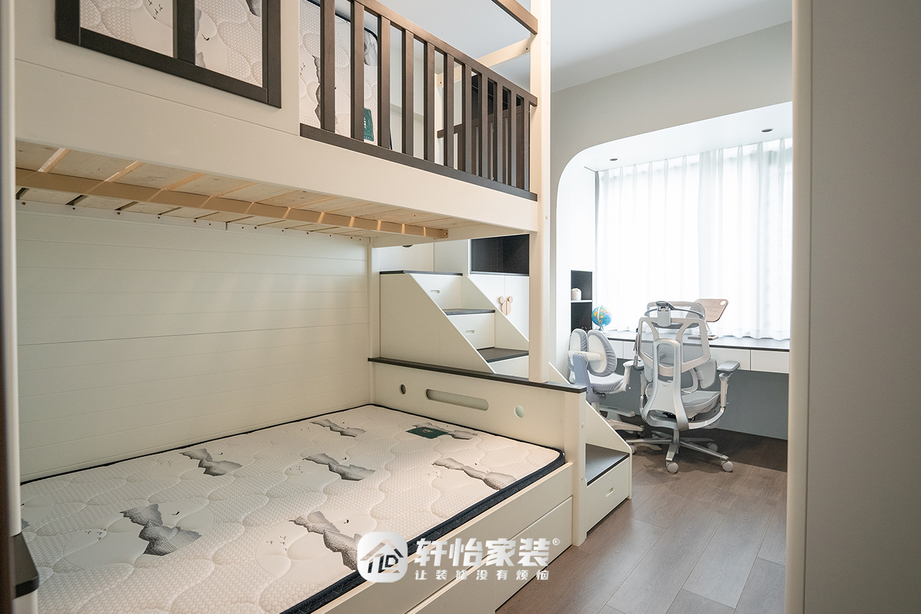 儿童房通过上下床释放了更多地面空间,也为孩子带来纵向探索的趣味。依托窗户打造的学习区,光线充足,格局有序,令生活呈现出条理。