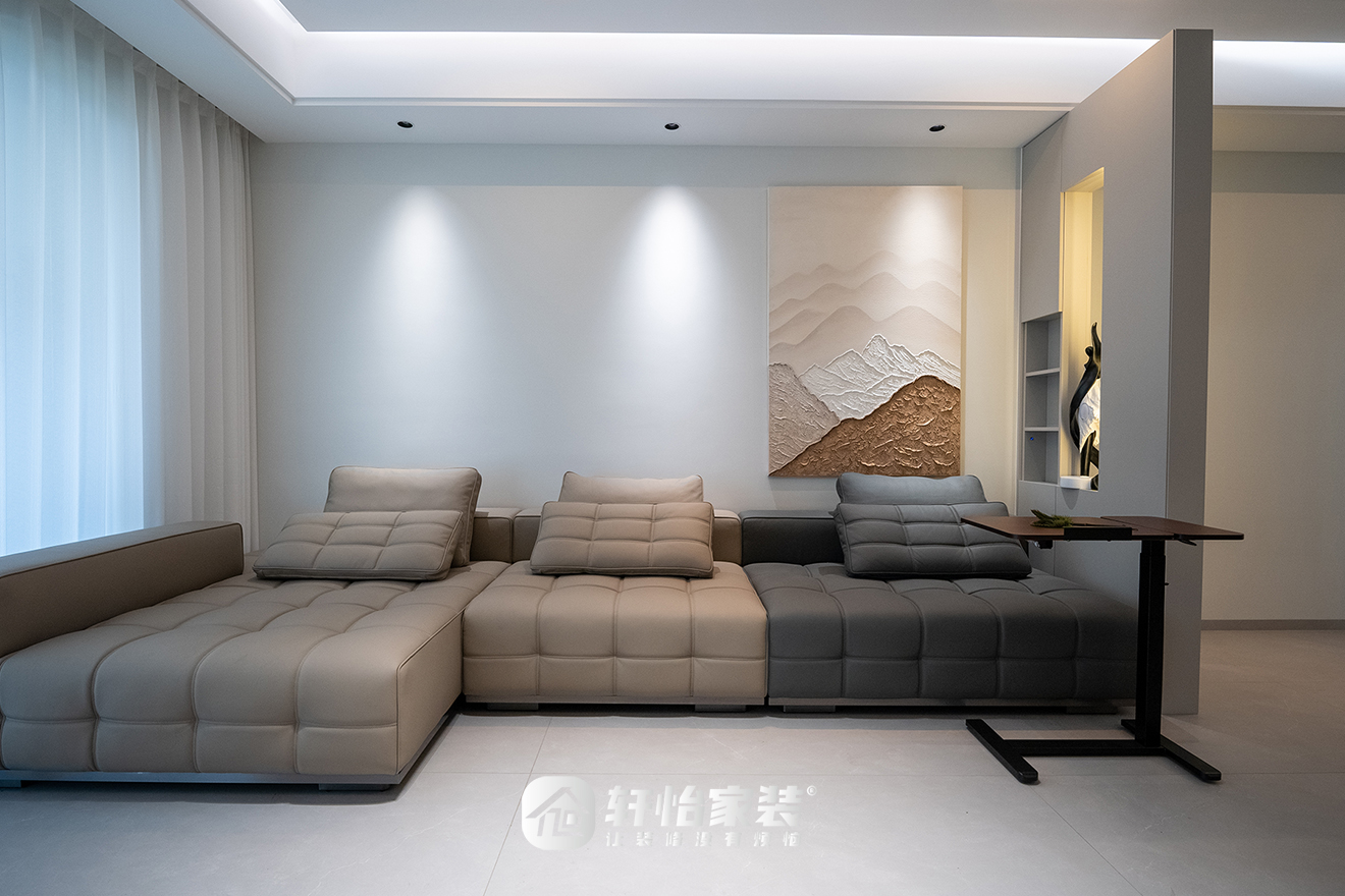 模块化沙发满足多种使用需求,简约线条与纯净颜色,与整体风格相应的同时,又承接居住者的身体情绪。轩怡家装利用饰画与灯光呼应,组合出远方的山海意象,是精神的向往。
