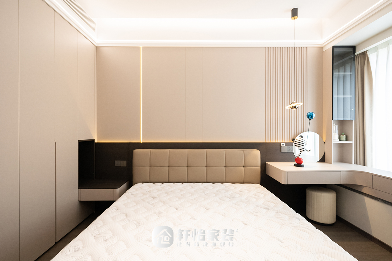 主卧利用浅咖与深棕的暖质,带来丝丝暖意,演绎出一种回归上的安宁。通顶衣柜放入开放格,上下位置呼应,打破柜子单调,以克制笔法书写层次。