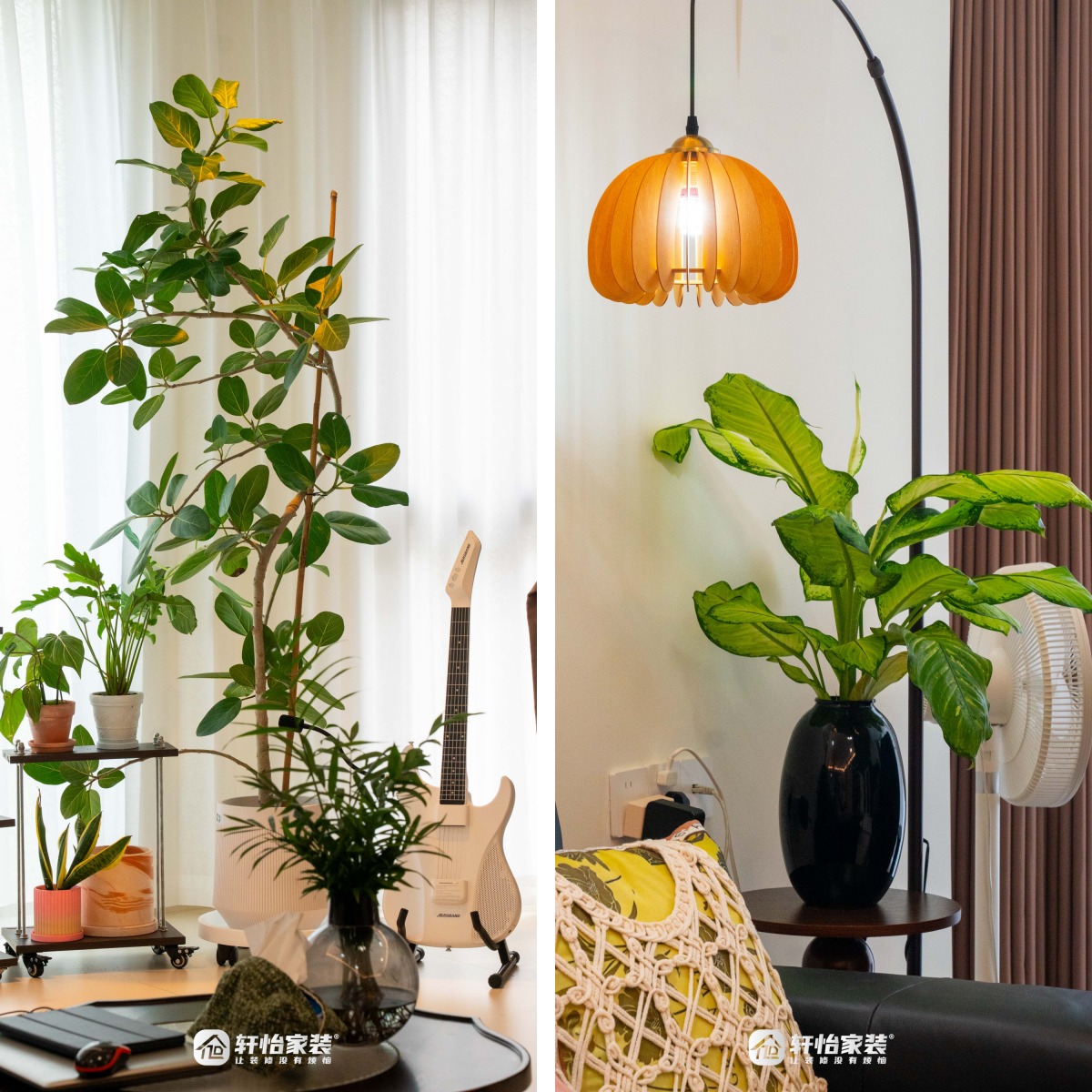 绿植的曲线在其中点缀,柔化中和墙面硬朗线条,带来一种折衷的美感。似隐似现的吉他、推车象征着生活另一面,呼应着奶油法式风对艺术的追求。