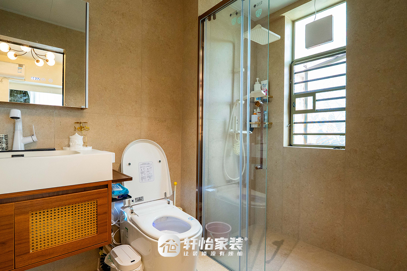 干湿分离已是卫生间标配,设计师在细节上做出优化,淋浴房采用三联动门,让空气尽可能的自然流通。