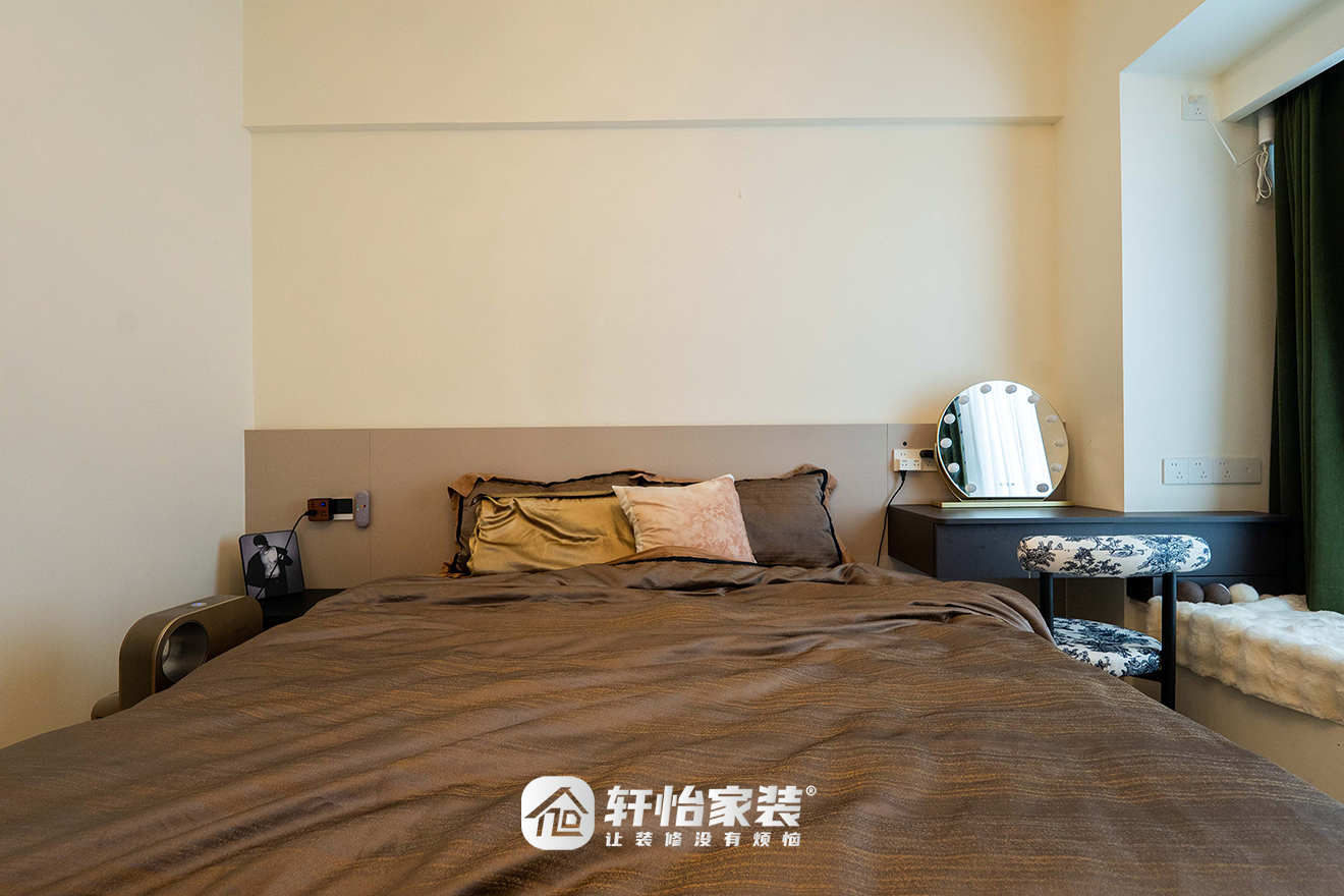 床头与飘窗柜连成一体,将散落的功能区串成整体,流畅又带有线条的筋骨。蓬松柔软的床品带来包裹感,令人拥有整晚安眠。