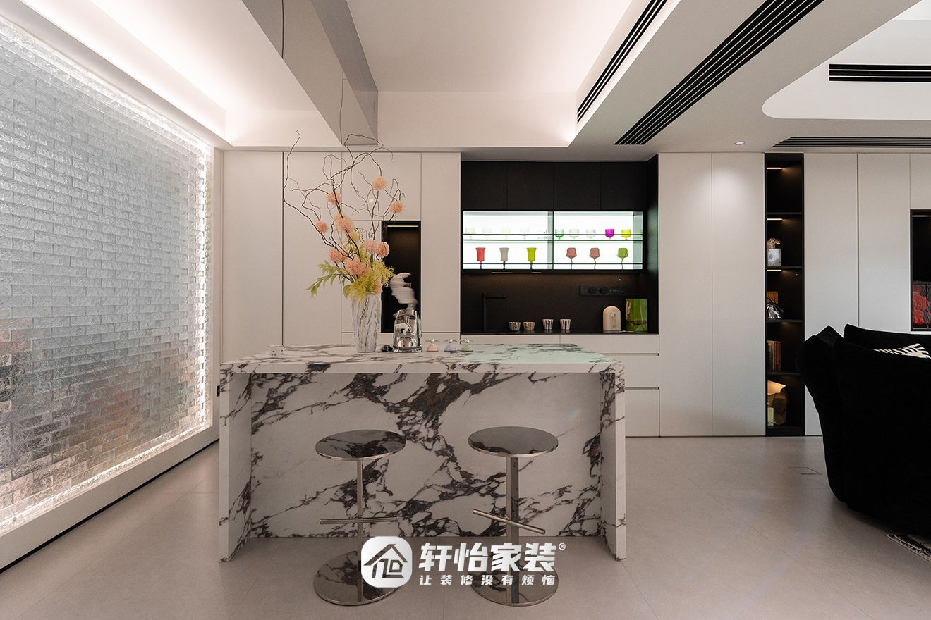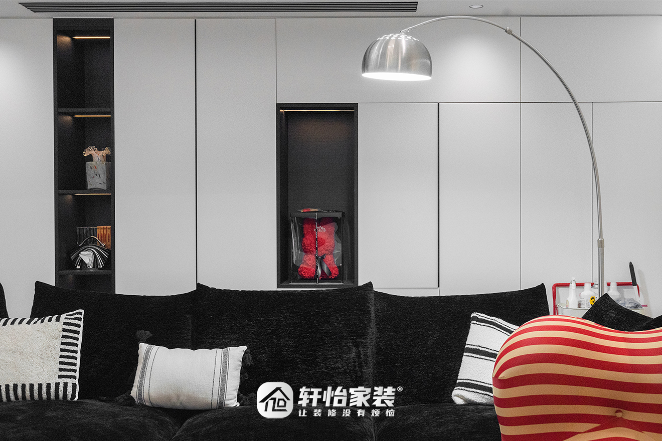 在保有充足收纳量的同时,轩怡家装对沙发后的收纳柜细节注入巧思,使其与整体艺术格调深层呼应,实现了功能与美学的统一。