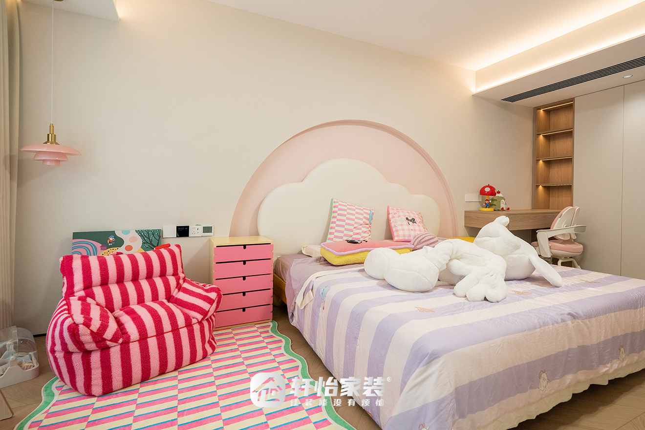 儿童房的设计则体现了前瞻性,并未使用过于幼稚的符号化元素,而是通过沙发、地毯、书架上的丰饶色彩,满溢出生命灵气,为孩子的成长留出了足够的想象和改变空间。