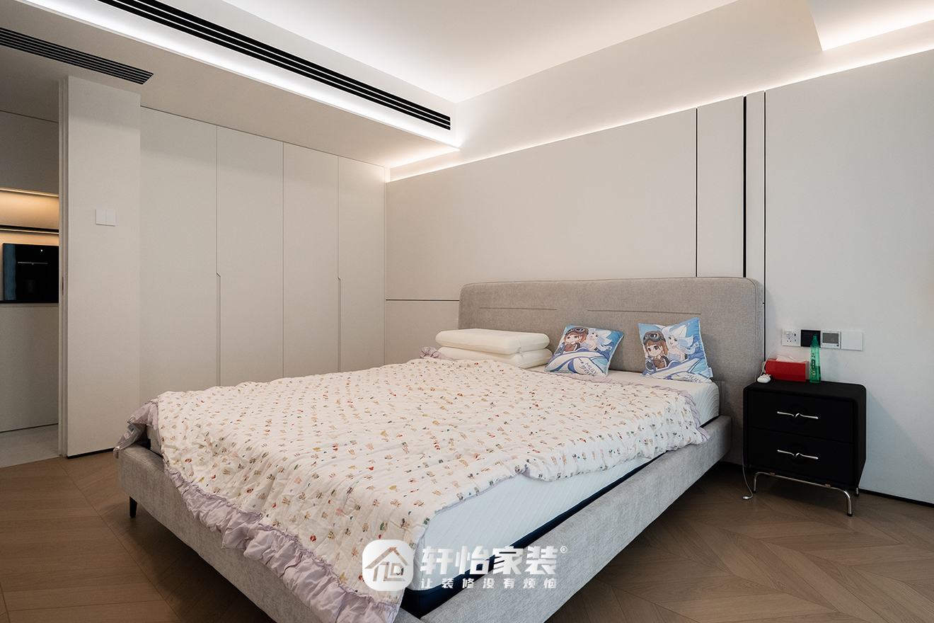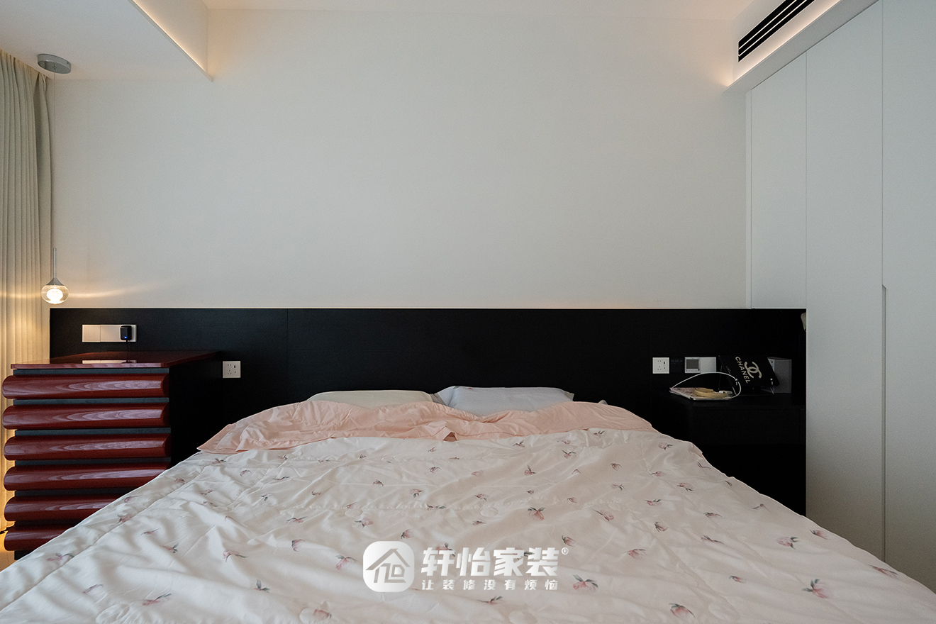 次卧设计手法更为克制,轩怡家装凭借光影和线条就勾勒出平静舒展的氛围,串珠吊灯有机地链接角落的软装,产生呼吸感。