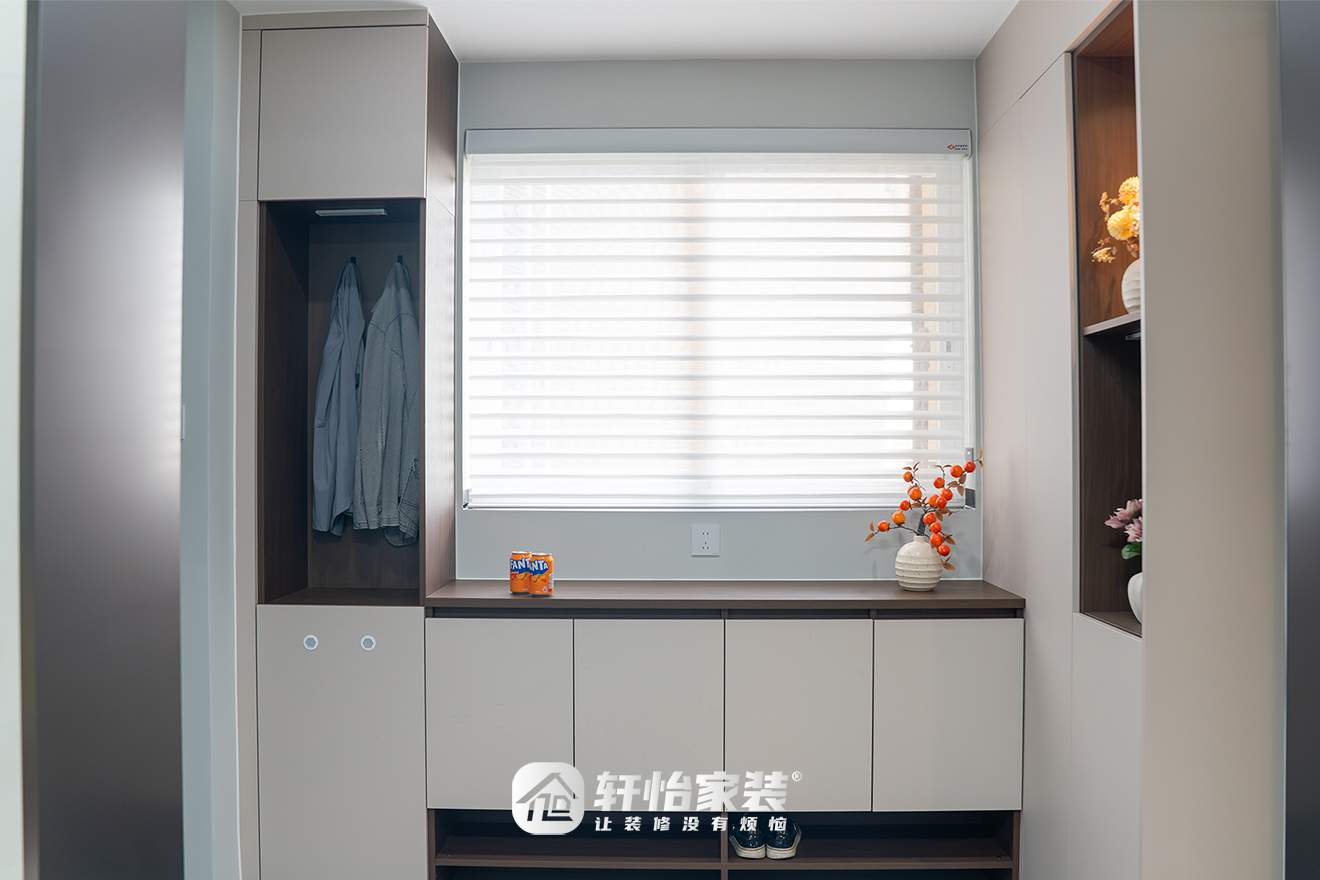 入户恰到好处的窗体,构成了天然的取景框,倚窗而设的悬挑式柜体,既能藏匿所有外出杂物,保持视觉***整洁,开放格又可作为艺术品的展示台,高等感自此奠定。