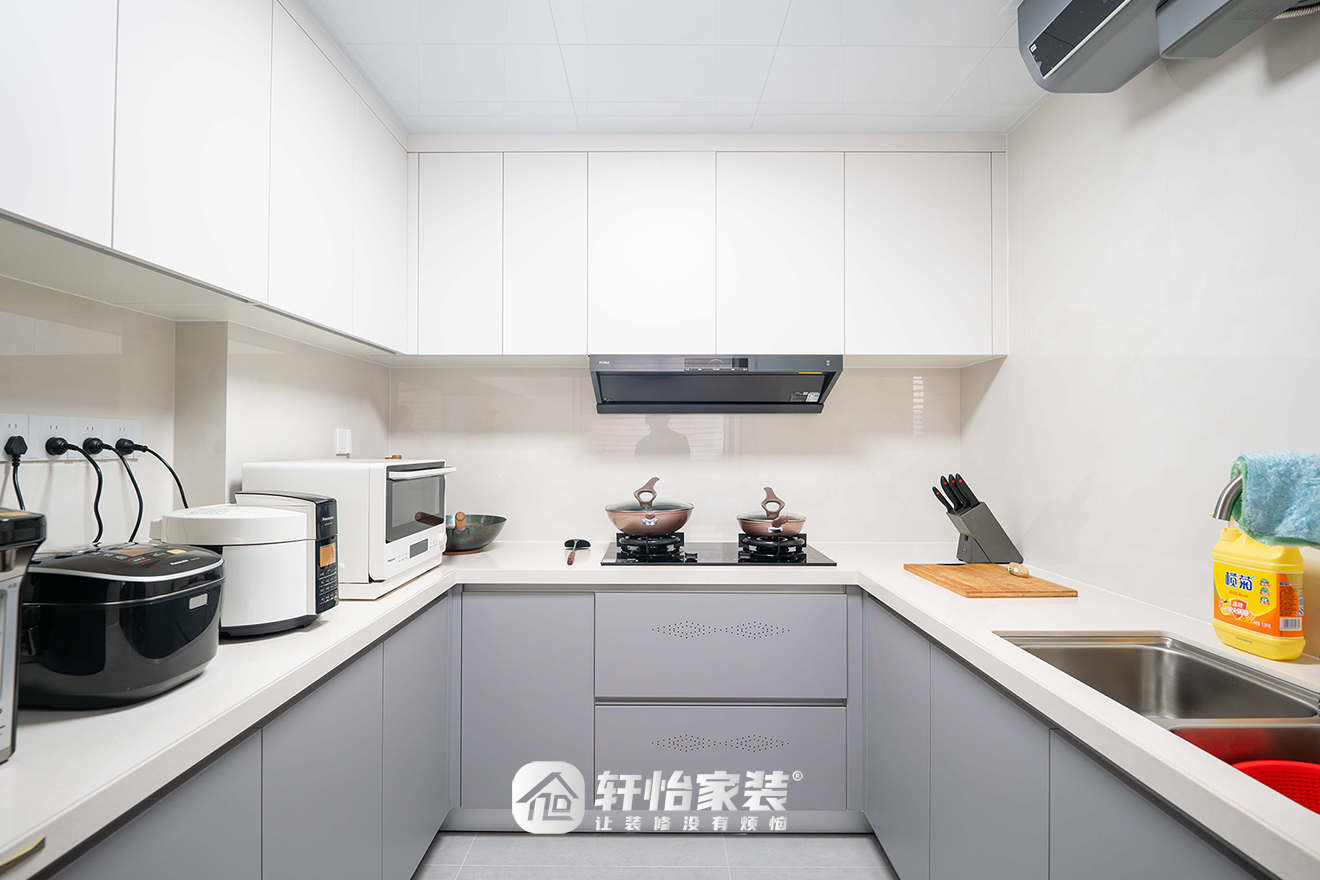 厨房采用U型操作动线,洗、切、炒路径清晰,很大程度减少无效移动。利落简约的配色富有层次,考虑空间的秩序感与材质的耐久度,支撑长期高频的家庭使用。