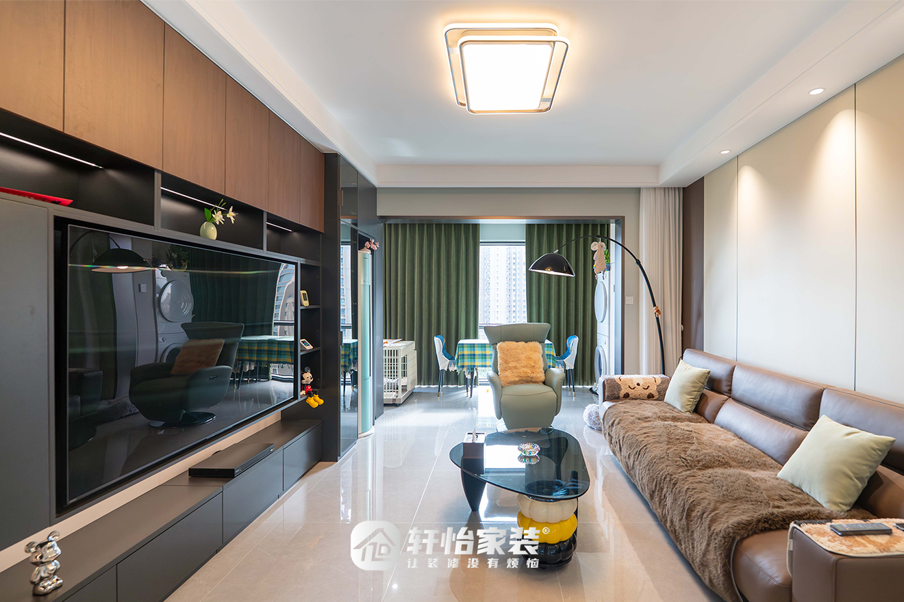 家有萌宠用如何设计?本案127㎡的三房两厅两卫,轩怡家装以胡桃木为摩登色彩线索,通过材质搭配、动线规划与功能考量,量身打造耐看、耐住、耐生活的的居住空间。