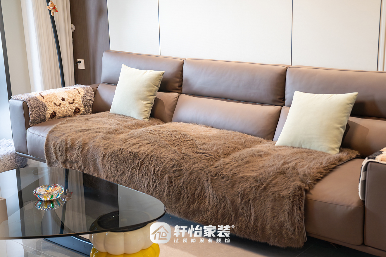 沙发表层皮革光泽高等,触感柔软,铺上同色系羊绒盖毯与米白抱枕,更添慵懒暖意。
