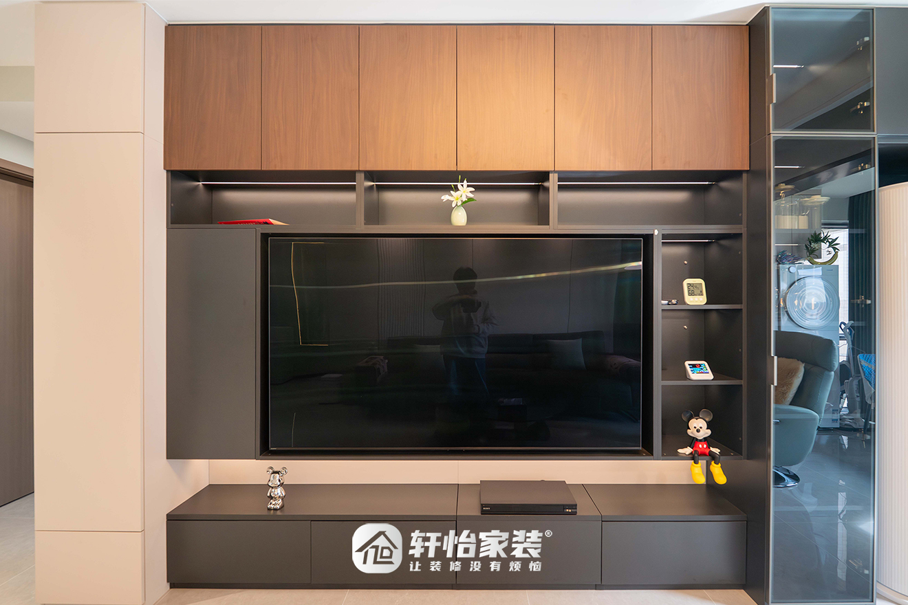 电视墙以黑色哑光柜体为基底,嵌入大尺寸电视,左侧引入胡桃木色开放柜,右侧则搭配通透的黑色玻璃柜门,材质碰撞间,层次感立现。