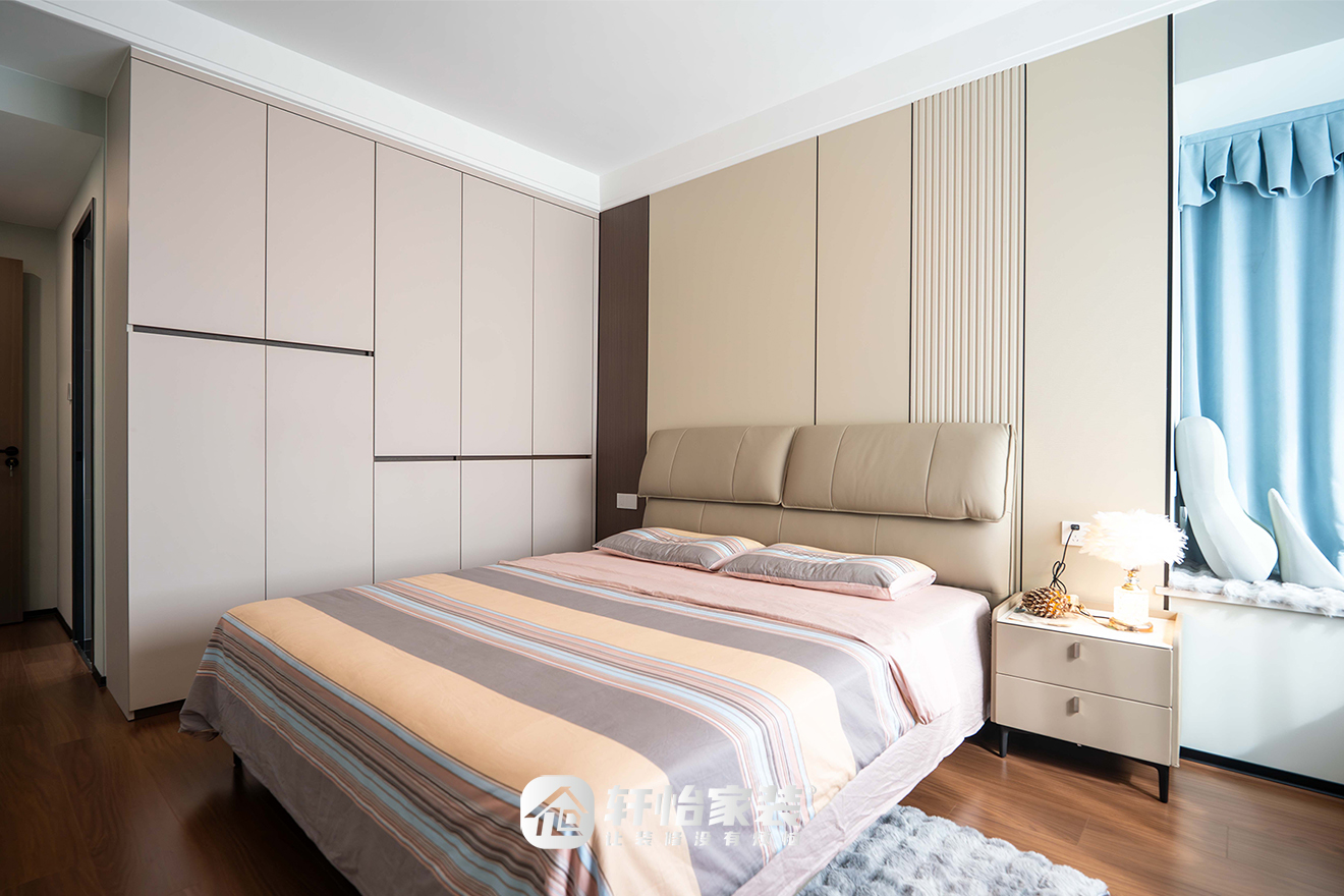 主卧延续了公区的静谧与高等。米色软包床头,弱化空间硬度,提升休憩舒适度。一侧顶天立地的收纳柜,***简约,将收纳化为无形,实现空间满分利用。